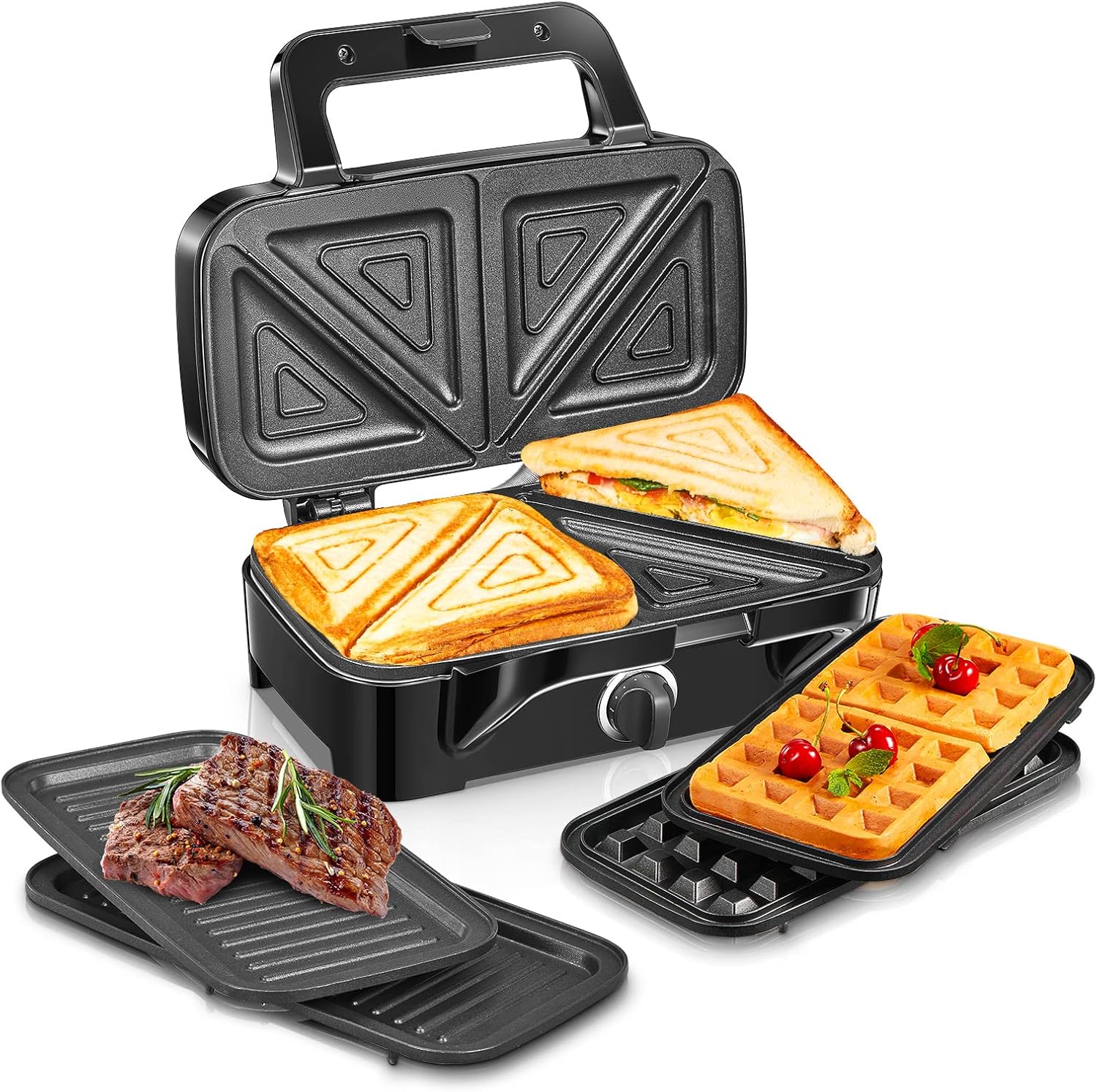 L’appareil Croque Monsieur pour le petit-déjeuner avec une puissance plus élevée. Le puissant radiateur de 1200 watts est prêt en 2 à 3 minutes, attendez 3-5 minutes et vous pourrez avoir un délicieux sandwichce! Tournez le bouton sur 5 pour un chauffage plus rapide!Avec 3 plaques interchangeables, cet appareil est parfait pour les sandwichs classiques, les gaufres croustillantes, le steak juteux, les légumes légèrement brûlés, etc. De plus, ces plaques amovibles avec revêtement antiadhésif de haute qualité sont hydrofuge et oléofuge, facile à nettoyer.3-4 niveaux conviennent aux sandwichs, 4-5 niveaux conviennent aux gaufres. Plus le nombre est élevé, plus la vitesse de chauffage est rapide. Remarque : après le branchement, le voyant vert ne s'allume que lorsque la vitesse est réglée.La machine à sandwich FOHERE est compacte (28,9* 22,9* 11,8CM). Le verrou de la poignée permet de le ranger verticalement pour économiser de l'espace, et il y a 2 supports en bas pour le rangement des câbles. Cette machine à panini portable polyvalente est idéale pour les voyages, le bureau et l'école. Savourez de délicieux plats à tout moment, n'importe où.Les pieds antidérapants et les poignées isolées garantissent un fonctionnement sûr. Indicateur LED (le voyant rouge est toujours allumé; le préchauffage ou le chauffage est terminé, le voyant vert est éteint).Le matériau supérieur est en acier inoxydable, qui dissipe rapidement la chaleur, veuillez ne pas le toucher avec vos doigts lors du chauffage