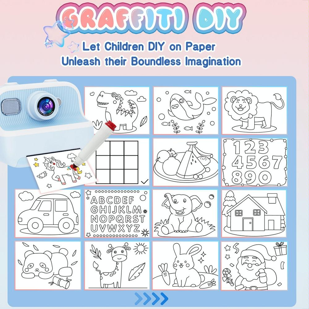 Inclus dans l'emballage: appareil photo, papier d'impression x3, câble USB, manuel d'instructions, lanière. Cet Appareil Photo Enfant est le cadeau idéal pour encourager la créativité et l'exploration de votre enfant.