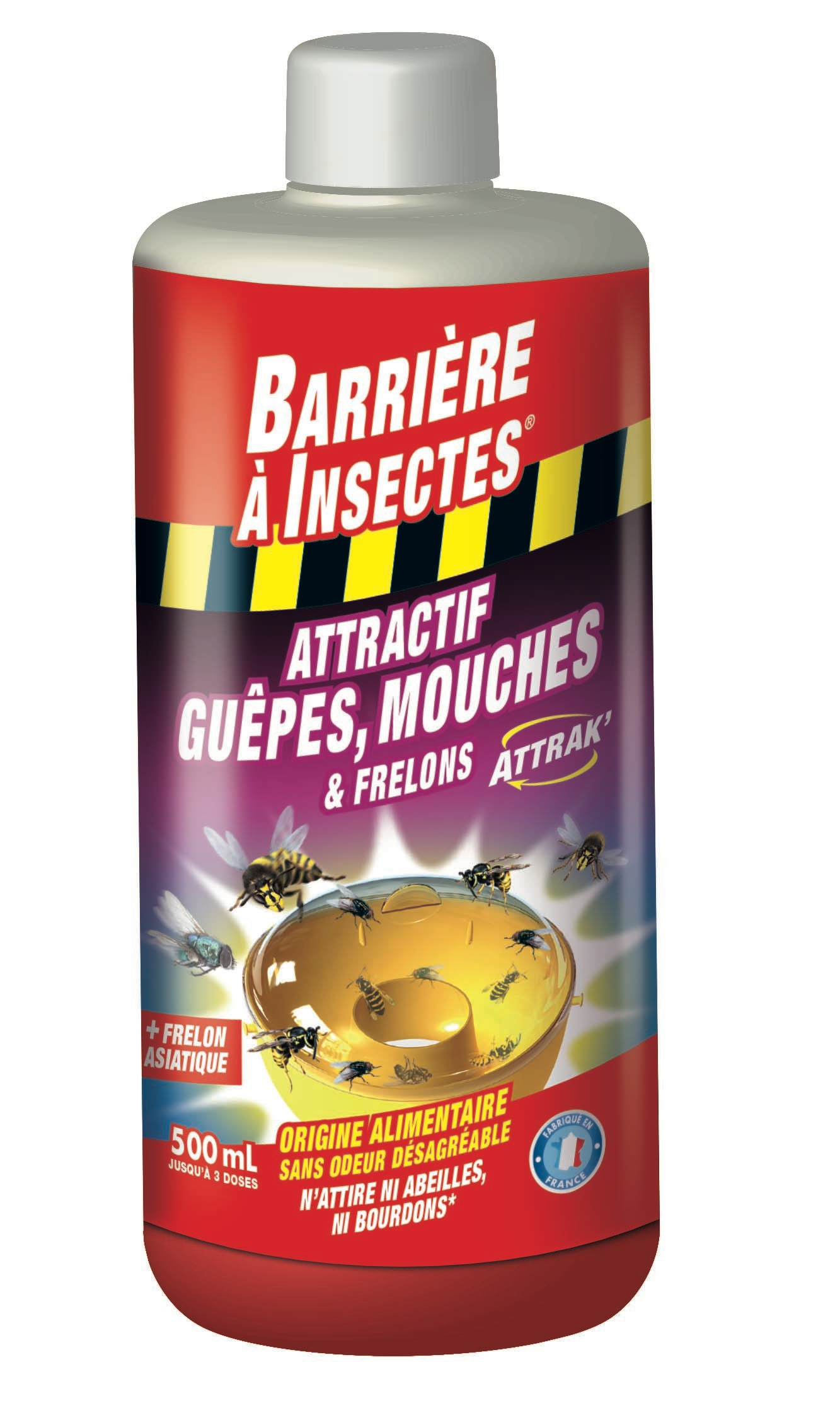 ATTRAK' GUÊPES, MOUCHES & FRELONS est un attractif concentré à diluer dans l'eau. Il attire les guêpes, frelons, frelons asiatiques, mouches et moucherons. A base d'ingrédients alimentaires ce produit est destiné à être utilisé avec le piège polyvalent BARPITRAP. Action immédiate et SANS ODEUR désagréable. N'attire pas les abeilles et les bourdons. Flacon gradué jusqu'à 3 doses d'emploi.