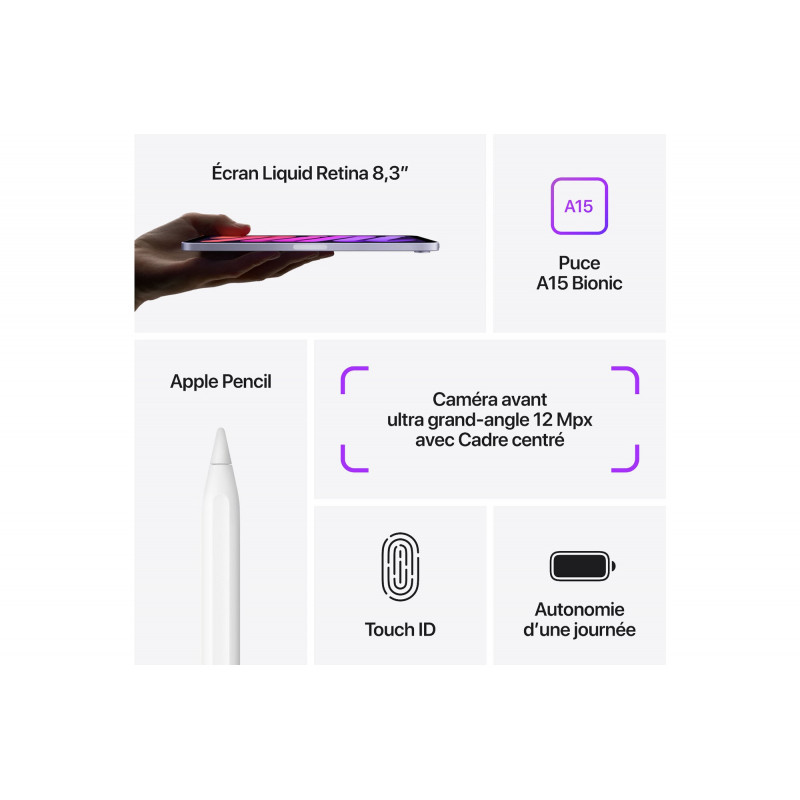| Libellé | Apple iPad mini 64 Go 21,1 cm (8.3") Wi-Fi 6 (802.11ax) iPadOS 15 Gris |