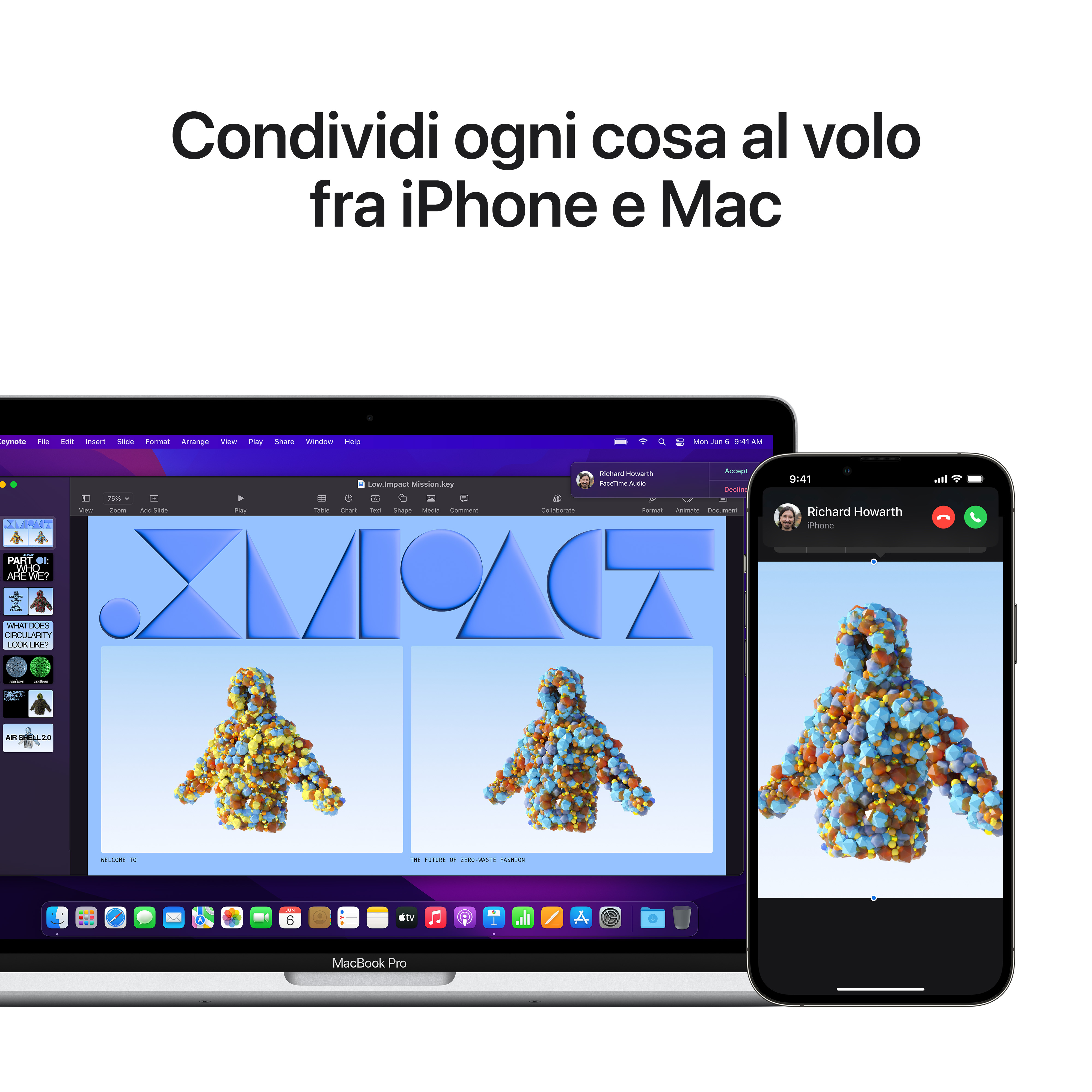 Apple MacBook Pro . Type de produit: Ordinateur portable, Format: Clapet. Famille de processeur: Apple M, Modèle de processeur: M2. Taille de l'écran: 33,8 cm (13.3"), Résolution de l'écran: 2560 x 1600 pixels. Mémoire interne: 8 Go. Capacité totale de stockage: 512 Go, Supports de stockage: SSD. Modèle d'adaptateur graphique inclus: Apple GPU. Système d'exploitation installé: macOS Monterey. Couleur du produit: Argent. Poids: 1,4 kg Un cran au‑dessus. La puce M2 inaugure la nouvelle génération de puces Apple. Elle offre encore plus de vitesse et d’efficacité énergétique que la M1. Vous avez tout ce qu’il vous faut pour expédier toutes les tâches avec un puissant CPU 8 cœurs. Créer de superbes visuels avec un GPU 10 cœurs d’une vitesse fulgurante. Exploiter un nombre accru de flux de vidéo ProRes 4K et 8K avec le moteur médias hautes performances. Et faire tout cela à la fois, en mobilisant jusqu’à 24 Go de mémoire unifiée plus rapide. Efficacité thermique Refroidissement actif. Performances fulgurantes. Grâce à son système thermique avancé et à l’efficacité des puces Apple, le MacBook Pro est en mesure d’assurer des niveaux de performances professionnels. Vous allez pouvoir solliciter le CPU et le GPU sans discontinuer. Performance collective. macOS et M2 conjuguent leurs efforts pour offrir plus de vitesse et de réactivité à toutes vos apps de référence, y compris Microsoft 365 et vos apps iOS. Plus de 10 000 apps et modules sont déjà optimisés pour les puces Apple. Et Rosetta 2 adapte sans problème les apps conçues pour les processeurs Intel afin que vous puissiez les utiliser sur votre MacBook Pro. Toute une salle de montage. Dans 1,4 kg. Le moteur médias hautes performances de la M2 prend en charge l’encodage et le décodage ProRes. Vous pouvez donc lire et monter jusqu’à onze flux de vidéo ProRes 4K et jusqu’à deux flux de vidéo ProRes 8K, y compris les vidéos ProRes 4K tournées sur iPhone 13 Pro12, et convertir vos projets au format ProRes jusqu’à 3 fois plus vite qu’auparavant13. Écran Retina Une vue imprenable. Le superbe écran Retina affiche chaque image avec un niveau de détail et de réalisme impressionnant. Le texte est d’une netteté et d’une clarté irréprochables. Le puissant rétroéclairage par LED assure des noirs profonds et des blancs lumineux, tandis que la large gamme de couleurs P3 livre des verts et des rouges encore plus éclatants que la gamme sRGB. Et comme le MacBook Pro est doté de la technologie True Tone, la balance des blancs s’adapte automatiquement à la température de couleur de la lumière ambiante, pour une expérience visuelle plus naturelle. Caméra et micros Faites-vous bien voir. Et entendre. Grâce à la puce M2, la caméra FaceTime HD peut désormais tirer pleinement parti de notre tout nouveau processeur de signal d’image. Vous êtes toujours à votre avantage dans les appels vidéo. Et lorsque vous dirigez une réunion, animez un podcast ou échangez avec vos proches, les micros de qualité studio veillent à ce que tout le monde vous reçoive 5 sur 5. Caméra FaceTime HD La puce M2 vous aide aussi à vous montrer sous votre meilleur jour. La réduction du bruit avancée fait ressortir les zones sombres avec plus de netteté. Et la détection des visages exploite le Neural Engine pour améliorer la balance des blancs et les niveaux d’exposition, et afficher un teint plus naturel. Ensemble de trois micros Une qualité studio. Sans le studio. Un rapport signal/bruit amélioré qui rivalise avec celui des micros professionnels. Magic Keyboard La perfection. En toutes lettres. Le Magic Keyboard vous garantit une frappe silencieuse, d’un confort et d’une précision remarquables. La Touch Bar vous présente les commandes que vous utilisez le plus, exactement là où vous en avez besoin. En vous servant moins des touches, vous gagnez un temps précieux. Et Touch ID permet une authentification simple et rapide pour des connexions et des achats sécurisés. Touch Bar Des raccourcis pour aller droit au but. Simplifiez-vous la vie grâce à toutes sortes de raccourcis et fonctionnalités pratiques, comme votre emoji préféré, vos différentes langues et un accès facilité à Siri. Touch ID Il vous suffit de toucher le capteur pour déverrouiller instantanément votre Mac, et d’exercer une légère pression pour le verrouiller. Utilisez votre empreinte digitale pour louer des films, acheter des apps ou accéder à des éléments comme des documents verrouillés ou des réglages système. Sans avoir à saisir votre mot de passe. Et lorsque vous faites des achats en ligne avec Apple Pay, Touch ID renseigne automatiquement vos informations de livraison et de facturation sans divulguer les coordonnées de votre carte bancaire.