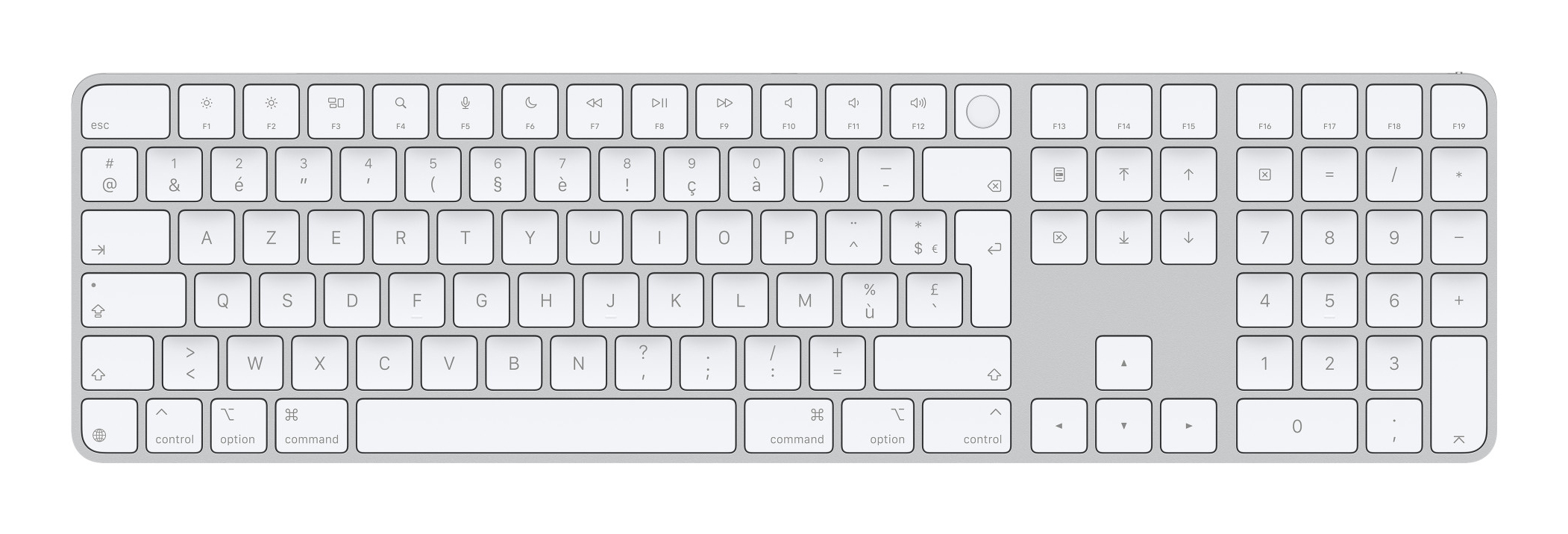 Apple Magic. Technologie de connectivité: Avec fil &sans fil, Interface de l'appareil: USB + Bluetooth, Disposition des touches du clavier: AZERTY, Lecteur d'empreintes digitales, Utilisation recommandée: Universel. Couleur du produit: Blanc