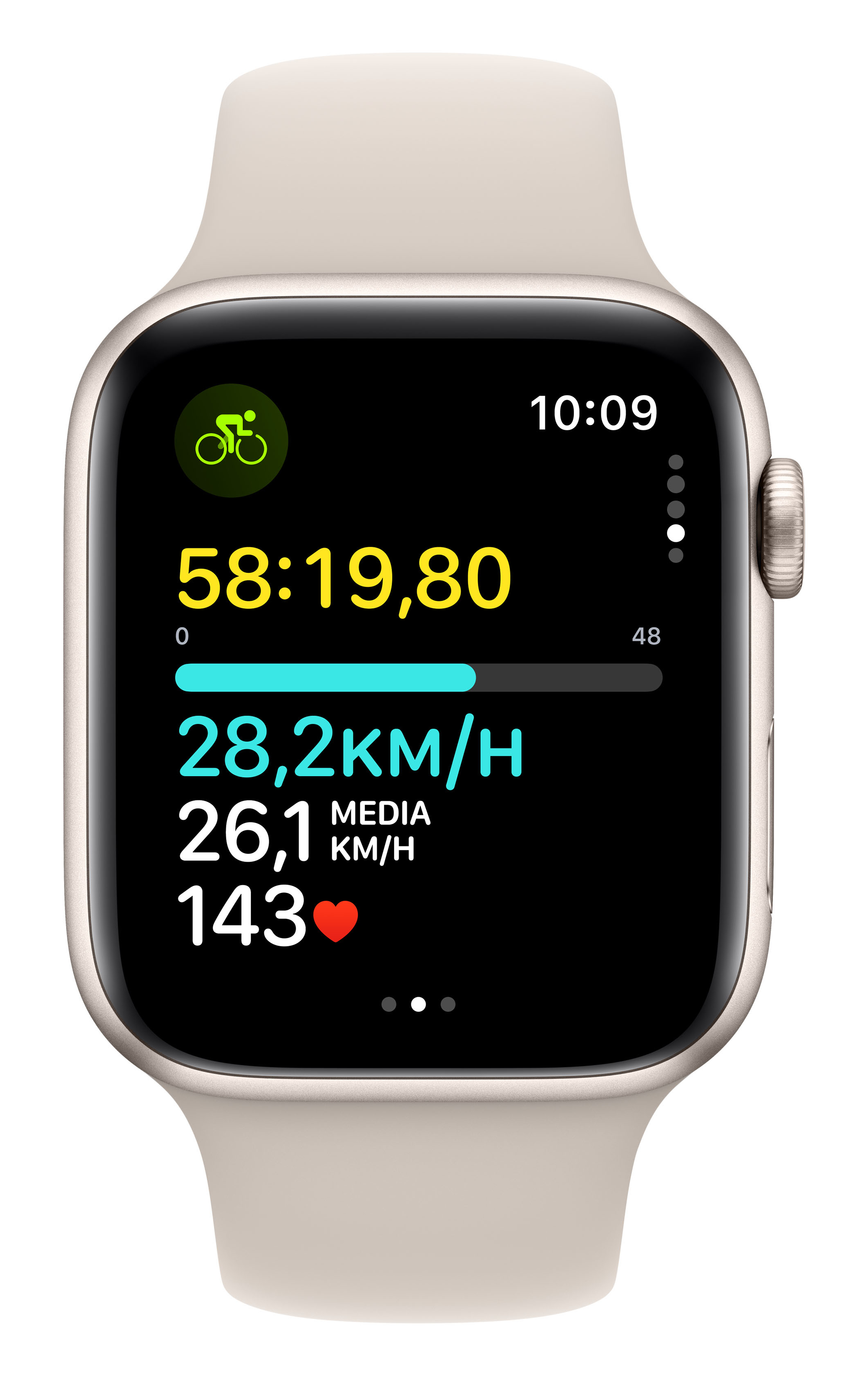 Apple Watch SE. Technologie d'affichage: OLED, Résolution de l'écran: 368 x 448 pixels, Écran tactile. Memoire flash: 32 Go. Wifi. GPS (satellite). Poids: 32,9 g. Humidité : étanche jusqu'à: 50 m, Couleur du bracelet: Beige, Taille du bracelet: S/M. Système d'exploitation installé: watchOS 9