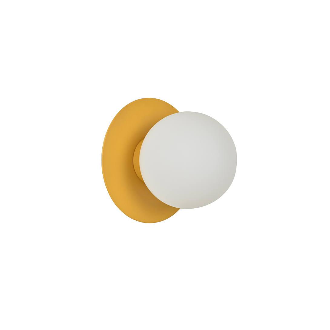 Applique base ronde en métal peint avec globe en verre. Coloris : moutarde mat. IP20. H20cm-L18cm. Classe 1. G9-33W.