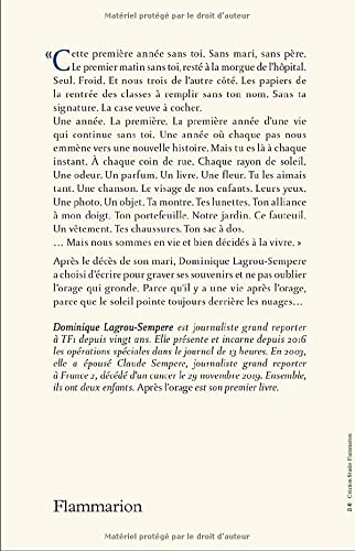"Cette première année sans toi. Sans mari, sans père. Le premier matin sans toi, resté à la morgue de l'hôpital. Seul. Froid. Et nous trois de l'autre côté. Les papiers de la rentrée des classes à remplir sans ton nom. Sans ta signature. La case veuve à cocher. Une année. La première. La première année d'une vie qui continue sans toi. Une année où chaque pas nous emmène vers une nouvelle histoire. Mais tu es là à chaque instant. À chaque coin de rue. Chaque rayon de soleil. Une odeur. Un parfum. Un livre. Une fleur. Tu les aimais tant. Une chanson. Le visage de nos enfants. Leurs yeux. Une photo. Un objet. Ta montre. Tes lunettes. Ton alliance à mon doigt. Ton portefeuille. Notre jardin. Ce fauteuil. Un vêtement. Tes chaussures. Ton sac à dos. ... Mais nous sommes en vie et bien décidés à la vivre." Après le décès de son mari, Dominique Lagrou-Sempere a choisi d'écrire pour graver ses souvenirs et ne pas oublier l'orage qui gronde. Parce qu'il y a une vie après l'orage, parce que le soleil pointe toujours derrière les nuages...