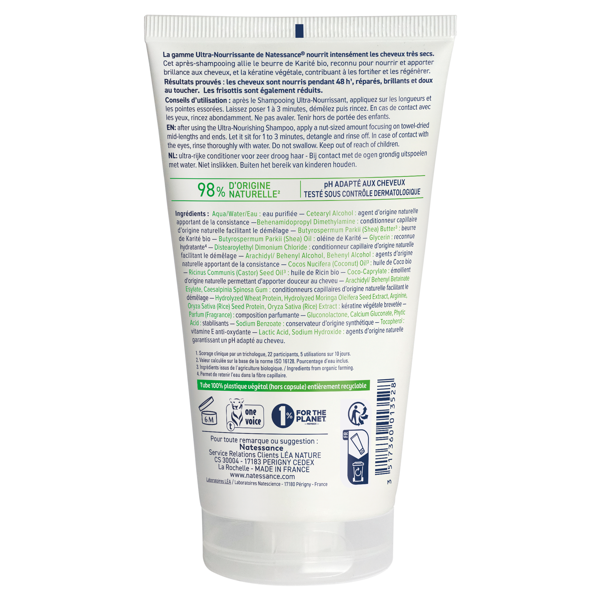 Natessance après-shampooing baume ultra-riche karité et kératine végétale 150 ml est un après-shampooing pour cheveux secs à très secs, crépus, frisés ou défrisés. ce baume ultra-riche contient du karité sous forme d'huile et beurre qui apporte nutrition et brillance aux cheveux. la kératine végétale permet de fortifier et régénérer les cheveux. sa texture ultra-riche permet de compléter l'action du shampooing. il démêle efficacement les cheveux secs, tout en leur apportant nutrition, brillance et souplesse. formulé sans silicone, sans sulfate, sans mcit. testé sous contrôle dermatologique.