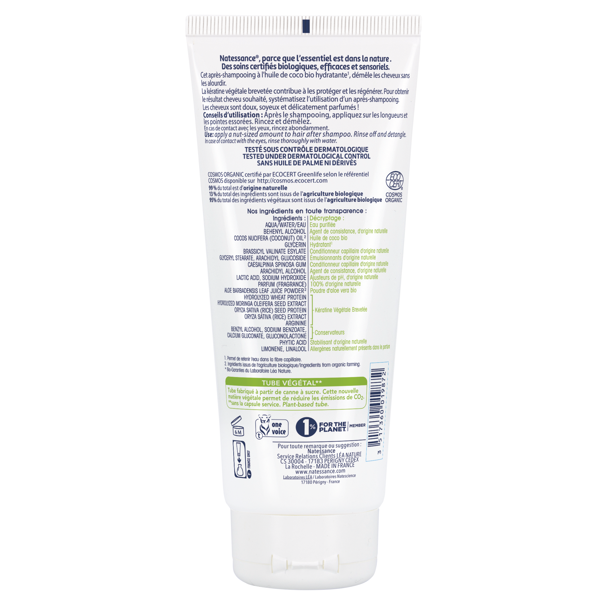 Natessance Après-Shampooing Extra-Doux Coco Bio et Kératine Végétale 200 ml est un après-shampooing à l'huile de coco bio hydratante, qui démêle les cheveux sans les alourdir.