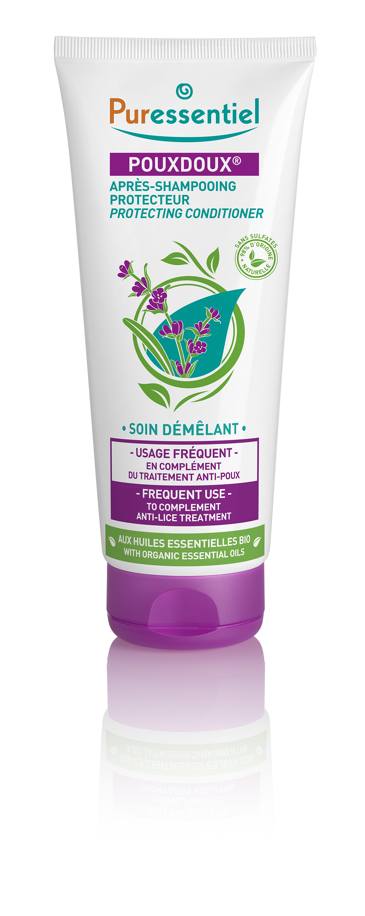 Composé d’huiles essentielles bio (Lavande, Lavandin, Ylang Ylang, Géranium) cet après-shampooing Pouxdoux est idéal pour le démêlage des cheveux et l’élimination des lentes et poux morts. Il s’utilise en complément du traitement anti-poux en usage fréquent. La formule à 98,3% d’origine naturelle de ce soin démêlant laisse les cheveux doux et agréablement parfumés. Les cheveux sont protégés, le cuir chevelu est apaisé. Testé et approuvé par les papas et les mamans* ! *Test d’usage sur 21 volontaires pendant 28 jours