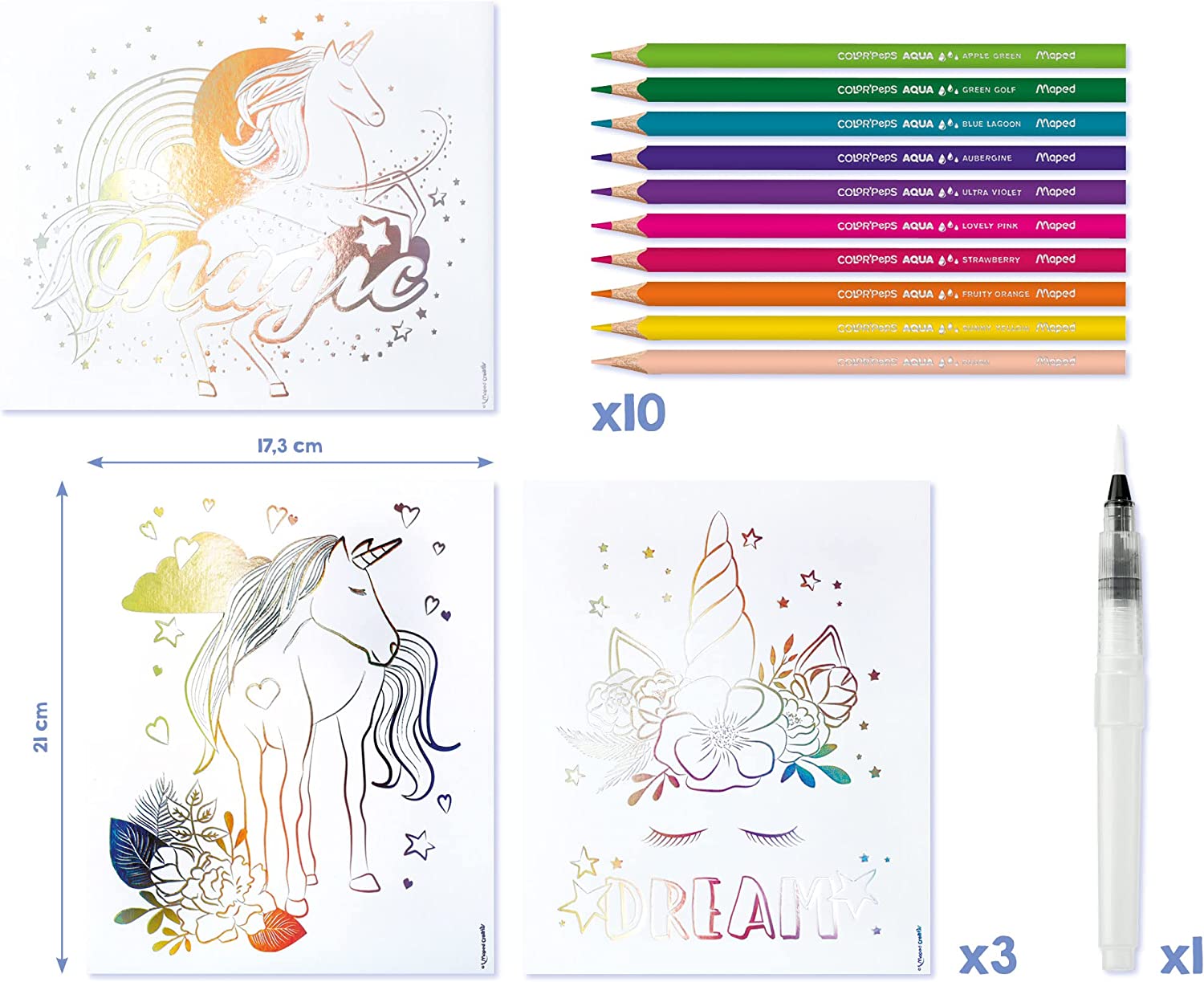 | Libellé | Aqua'Art Licornes - Activité Aquarelle pour Enfants - Coloriage aux Crayons Aquarellables + Pinceau à Eau sur Supports Métallisés |