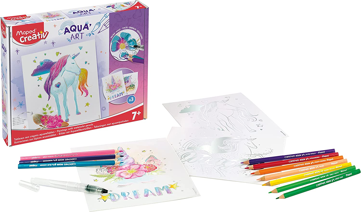 Passer le carrousel d'imagesAvec Aqua'Art, l'aquarelle est super accessible aux enfants ! Une bonne dose de coloriage au crayon aquarellable, un peu d'eau appliquée avec le pinceau à réserve, et le tour est joué ! Les enfants créent de magnifiques tableaux aquarelles au rendu métallisé unique. Aqua'Art permet à l'enfant de développer sa créativité, sa concentration et son imagination, tout en s'amusant ! La simplicité de l'activité laisse aux enfants une grande marge d'inventivité. Les possibilités de création de dégradés, de mélanges et effets vaporeux sont infinies ! Une fois les affiches réalisées, elles décoreront à merveille la chambre des enfants. La boite permet de créer 3 affiches sur le thème des licornes. À partir de 7 ans. Groupe industriel familial présent sur les 6 continents et dans plus de 125 pays, Maped est aujourd’hui leader mondial des fournitures scolaires et de bureau.