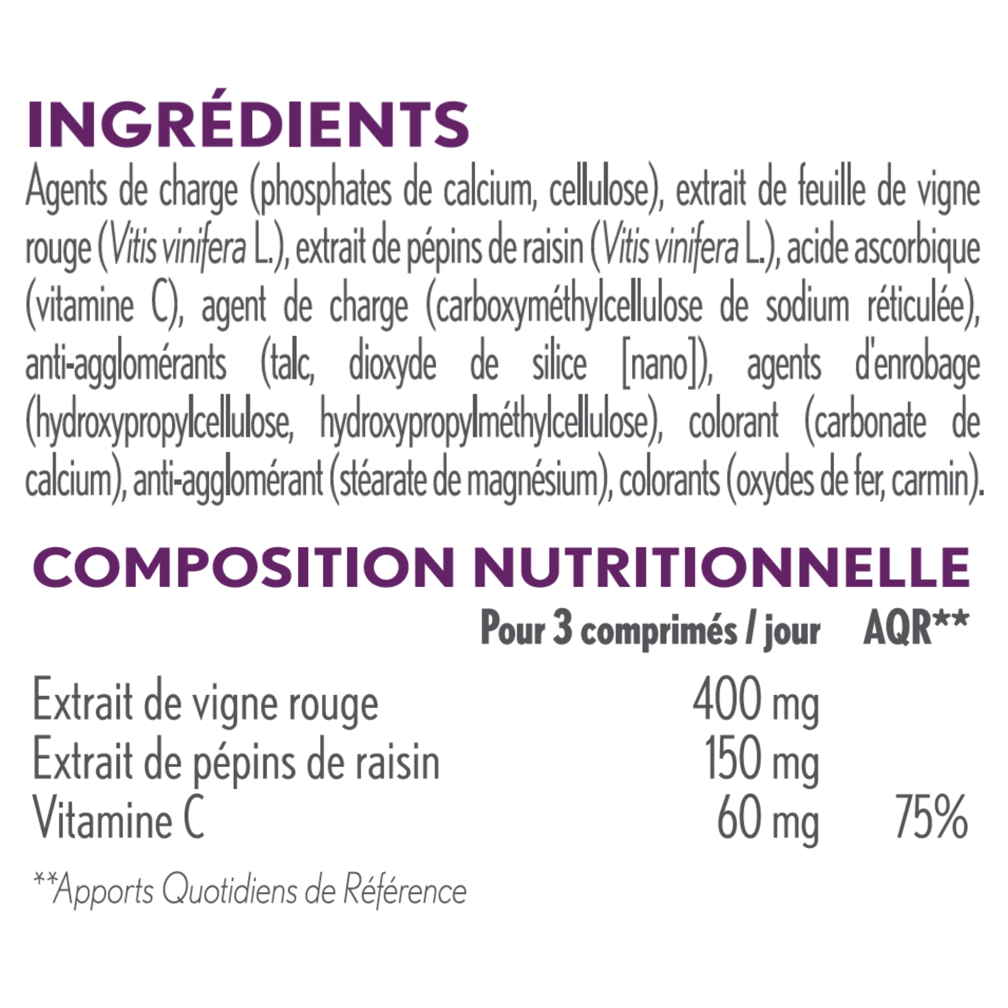 Ingrédients : Agents de charge (phosphates de calcium, cellulose), extrait de feuille de vigne rouge (vitis vinifera l.), extrait de pépins de raisins (vitis vinifera l.), acide ascorbique (vitamine c), agent de charge (carboxyméthylcellulose de sodium réticulée), anti-agglomérants (talc, dioxyde de silice [nano]), agents d'enrobage (hydroxypropylcellulose, hydroxypropylméthylcellulose), colorant (carbonate de calcium), antiagglomérant (stéarate de magnésium), colorants (oxyde de fer, carmin)