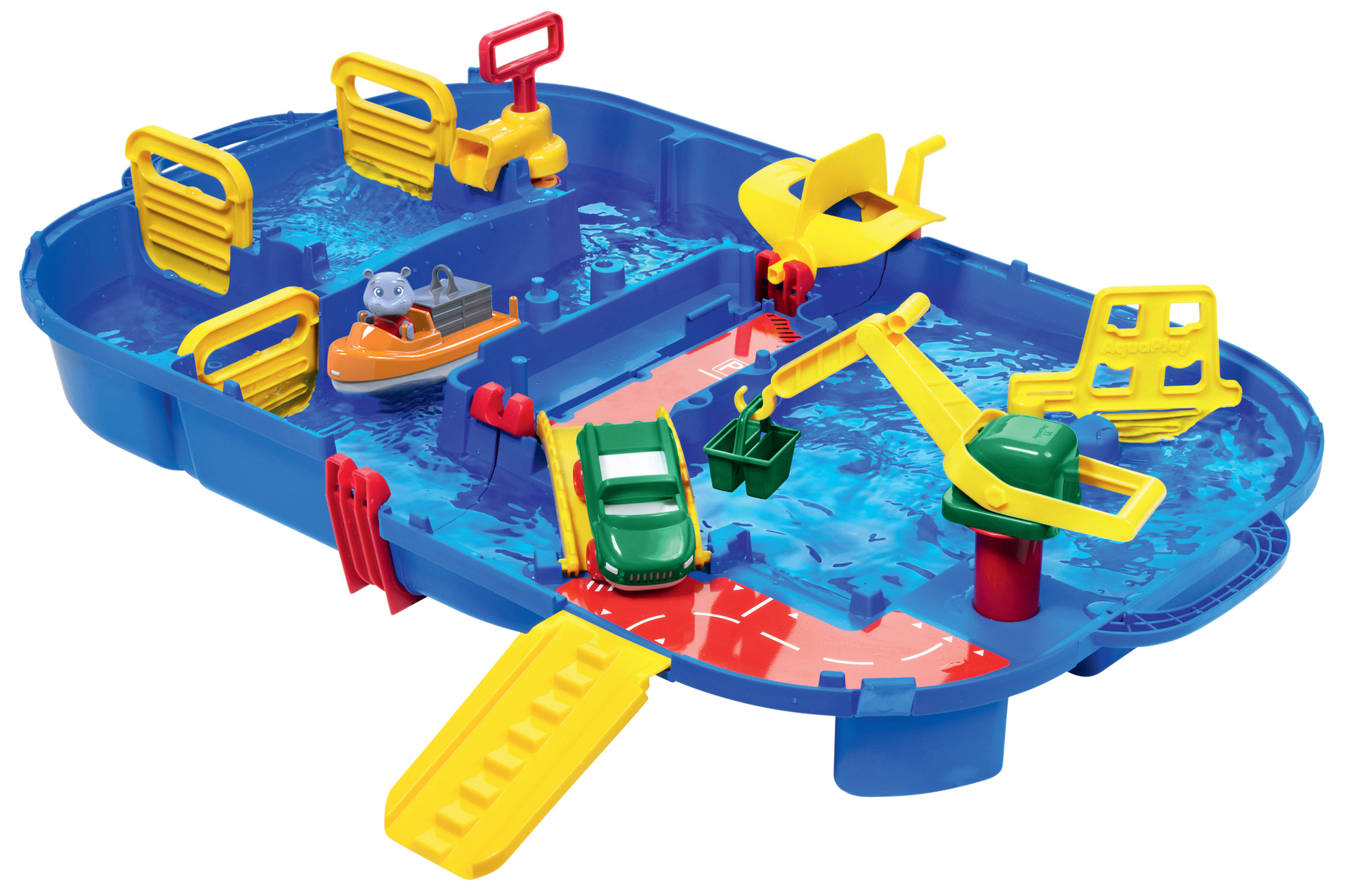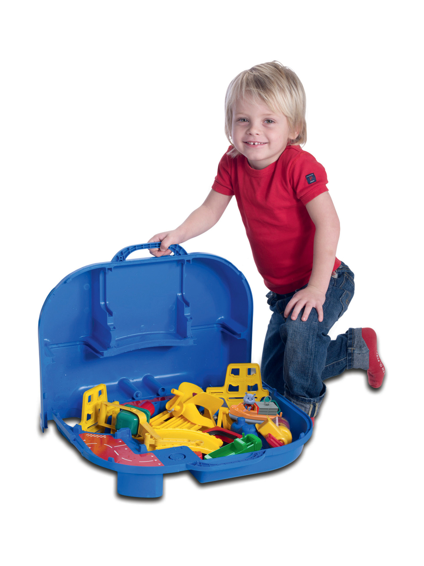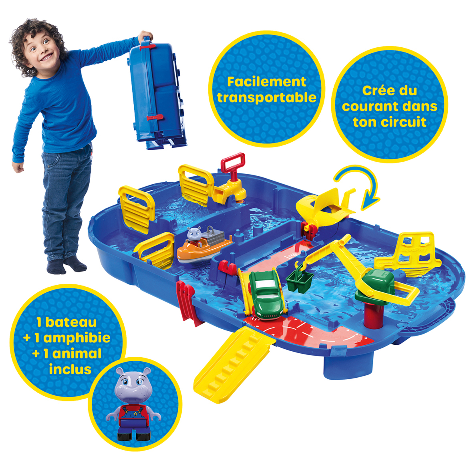 | Plus produit | Circuit de jeu d\'eau Aquaplay. 25 pièces dont 1 bateau à container + 1 amphibie et 1 animal. Différents niveaux, des accessoires mobiles, une écluse... Facilement transportable.\n\n |