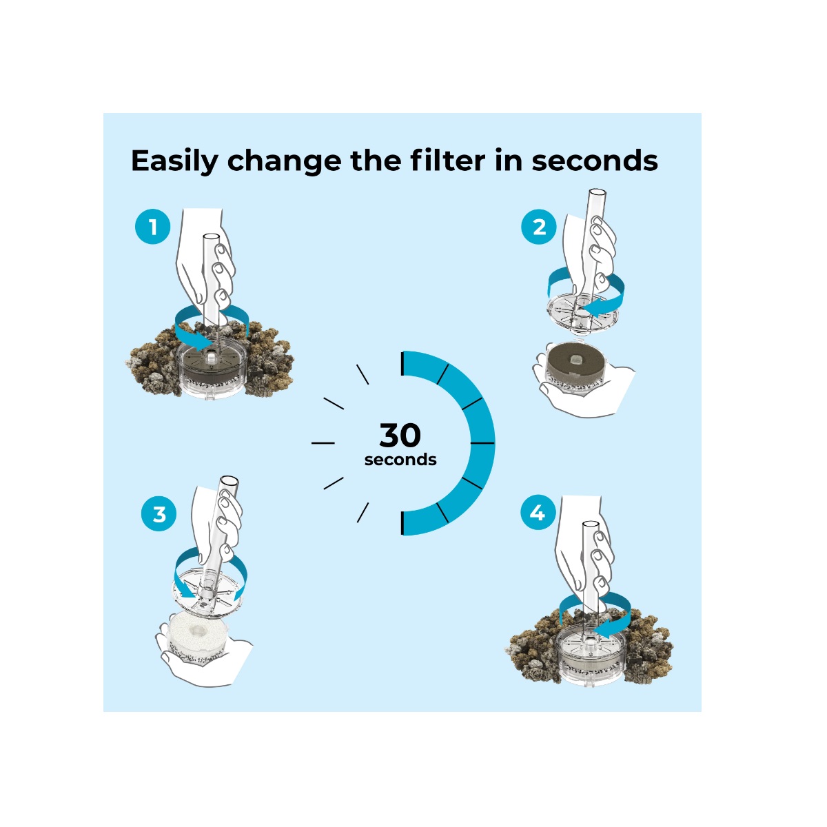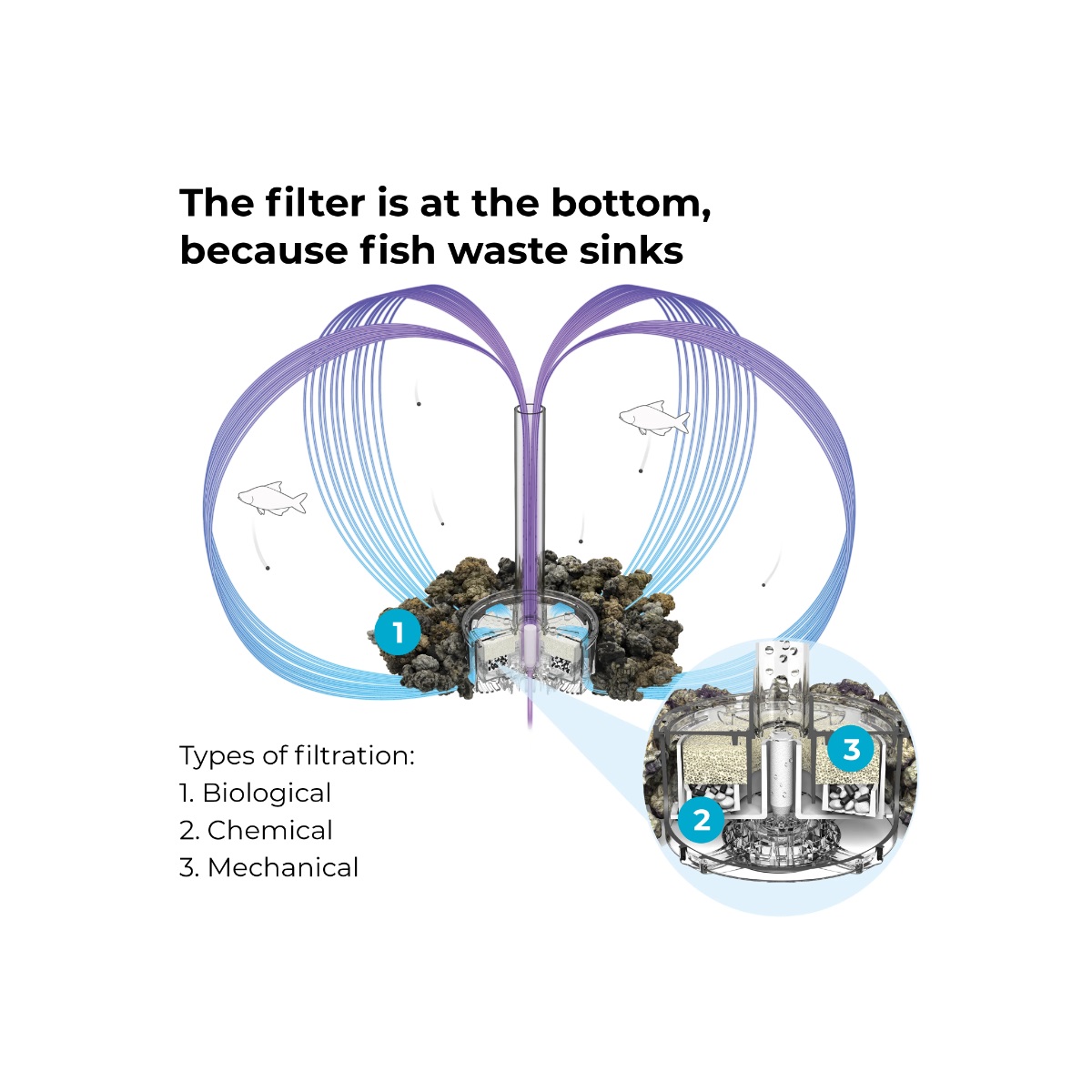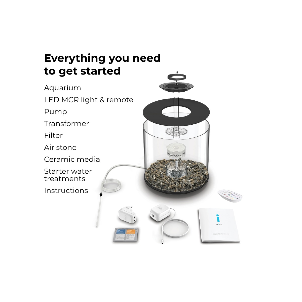 Accessoires inclus : Aquarium, pompe à air, éclairage LED, transformateur, traitements de l'eau, pierre à air, cartouche filtrante, média céramique et manuel d'instructions.