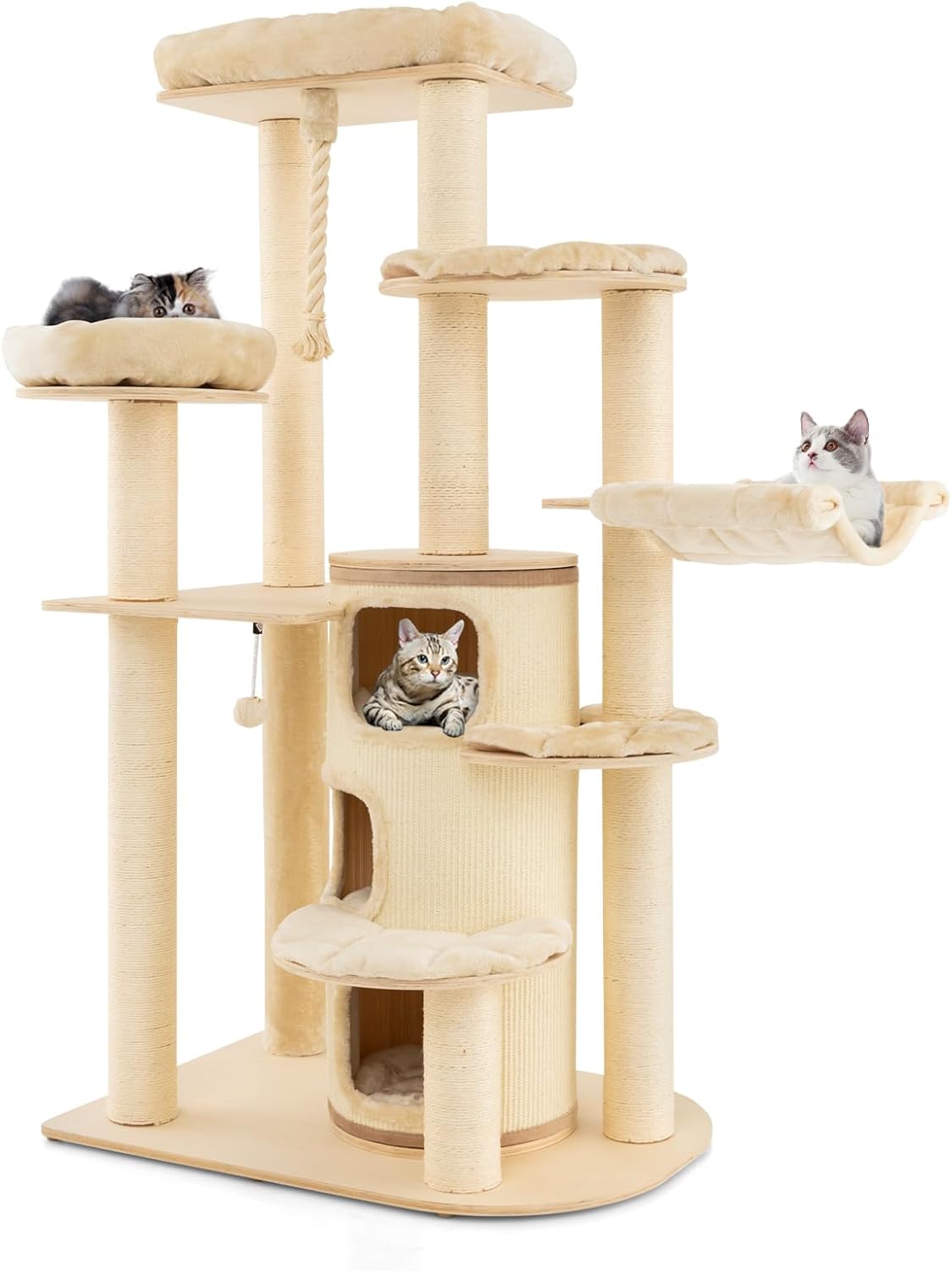 Arbre à chat 173cm en bois, perchoir supérieur, condo à 3 étages, hamac, griffoirs en sisal, boule beige