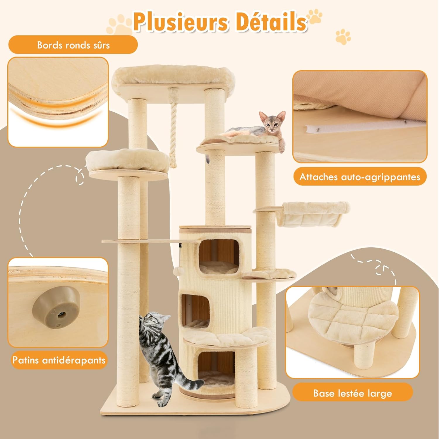 | Libellé | Arbre à chat 173cm en bois, perchoir supérieur, condo à 3 étages, hamac, griffoirs en sisal, boule beige |