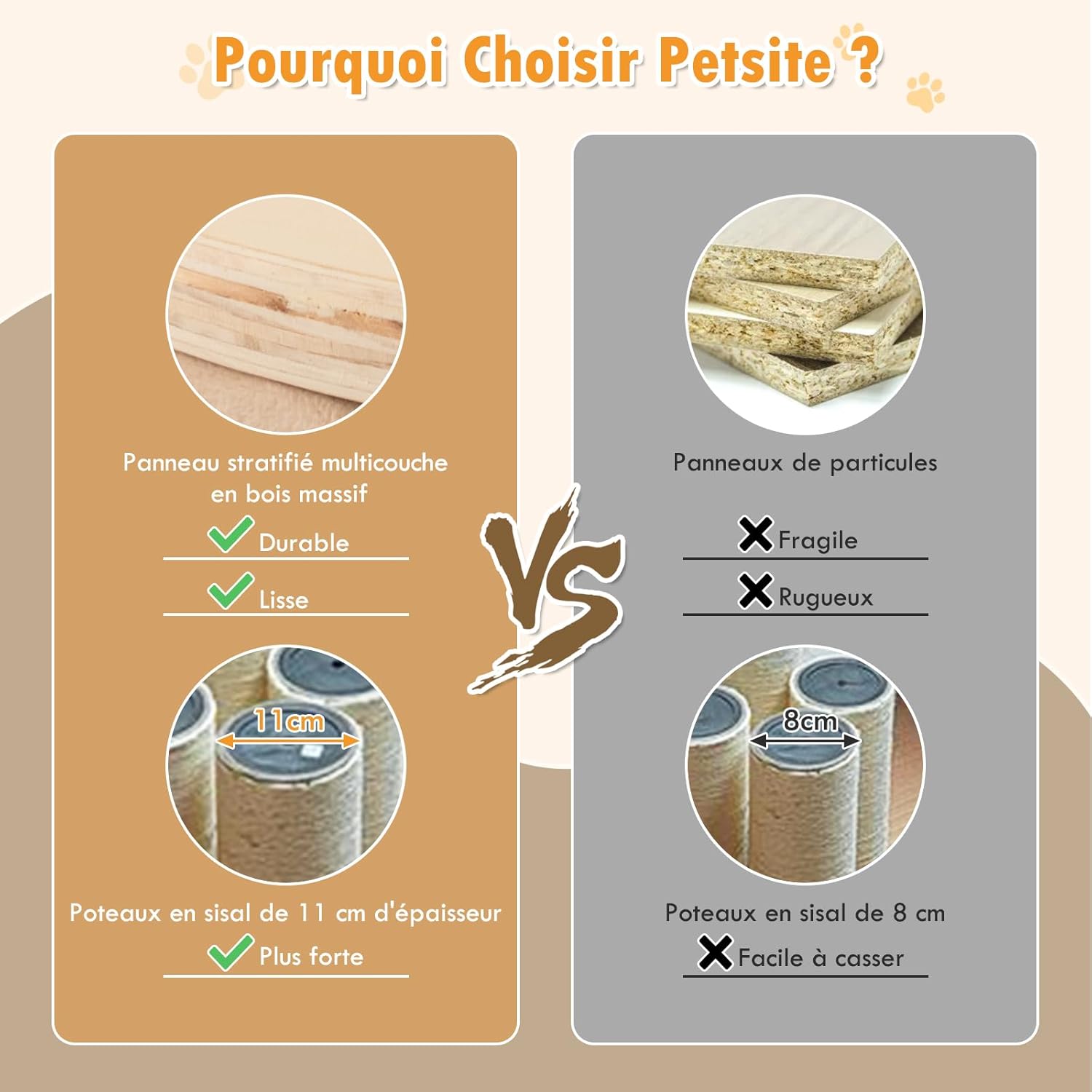 - Structure stable et robuste : Construit en panneau composite de bois massif multicouche, ce condo à plusieurs niveaux garantit une grande stabilité et durabilité. La base élargie et les coussinets antidérapants maintiennent l'arbre à chat stable pendant qu’ils sautent ou grimpent.
