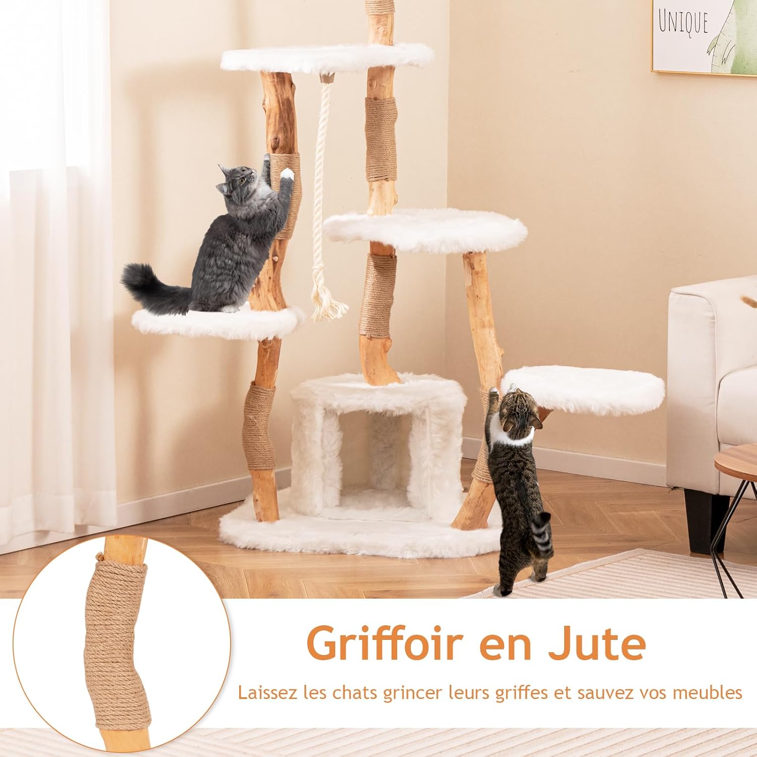 - Griffoir pour chat : protéger vos meubles en respectant l'instinct : Equipé de 2 griffoirs enveloppés de jute doux et d'une corde de sisal suspendue, cet arbre à chat permet à votre chat d'affûter ses griffes naturellement, gardant ses griffes saines et fortes. Plus de soucis de voir vos canapés ou vos meubles déchirés.