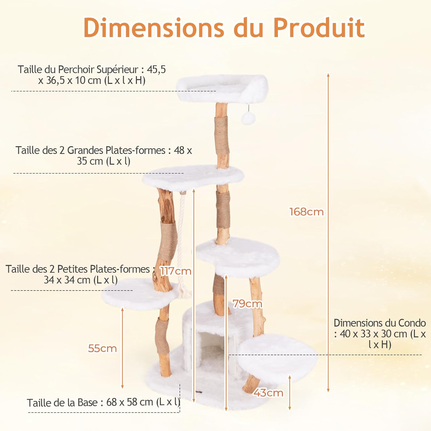 | Libellé | Arbre a chat à 6 niveaux en bois massif avec plateforme, perchoir, hamac, griffoirs en jute, niche 168cm |
