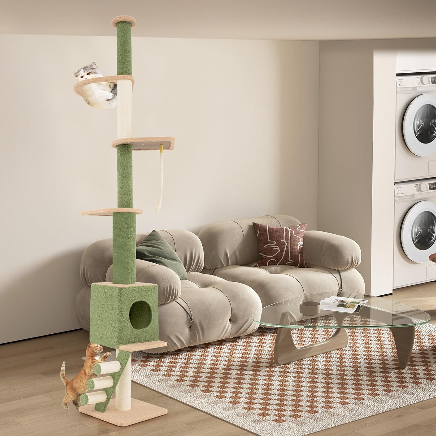 L'arbre à chat à 5 niveaux est équipé de 2 poteaux remplaçables et d'une tige de tension métallique réglable, vous permettant d'ajuster la hauteur facilement en fonction de la hauteur. Doté d'une capsule spatiale transparente et d'un condo privé pour chat, cette tour de jeu à chat offre des espaces de repos pour vos compagnons à fourrure. De plus, la tour à chat multi-niveaux comprend des poteaux à griffer en sisal entièrement enveloppés, une échelle à gratter et une corde en sisal suspendue, permettant aux chats d'affûter leurs griffes tout en protégeant vos meubles.