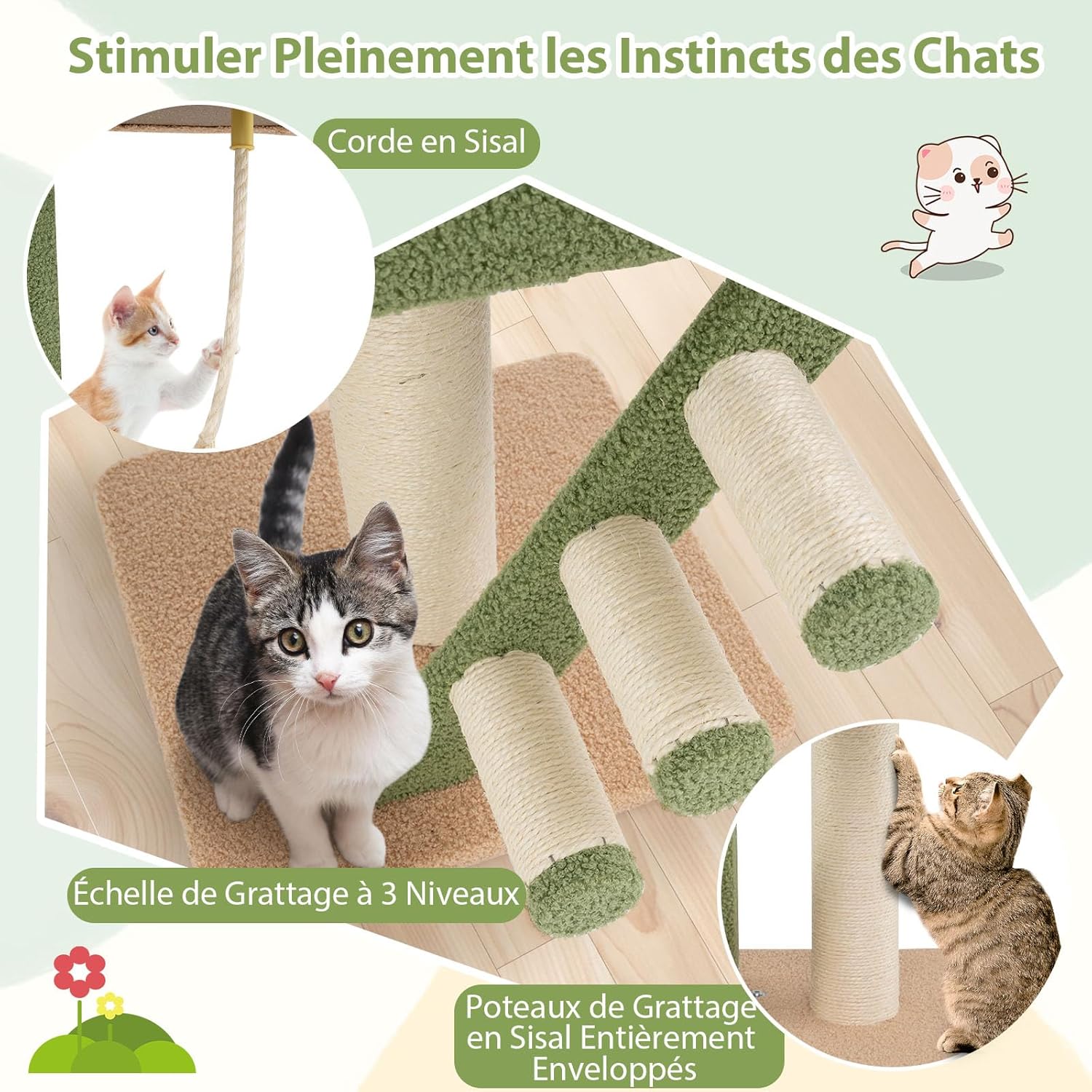 - Stimulation Complète des Instincts des Chats : Le stand de grimpe pour chat est équipé de 2 poteaux en sisal et d'une échelle à 3 étapes qui favorise l'entretien sain des griffes et protège vos meubles des dommages indésirables. De plus, une corde de sisal suspendue répondra à leur instinct de chasseur et les maintiendra en éveil.