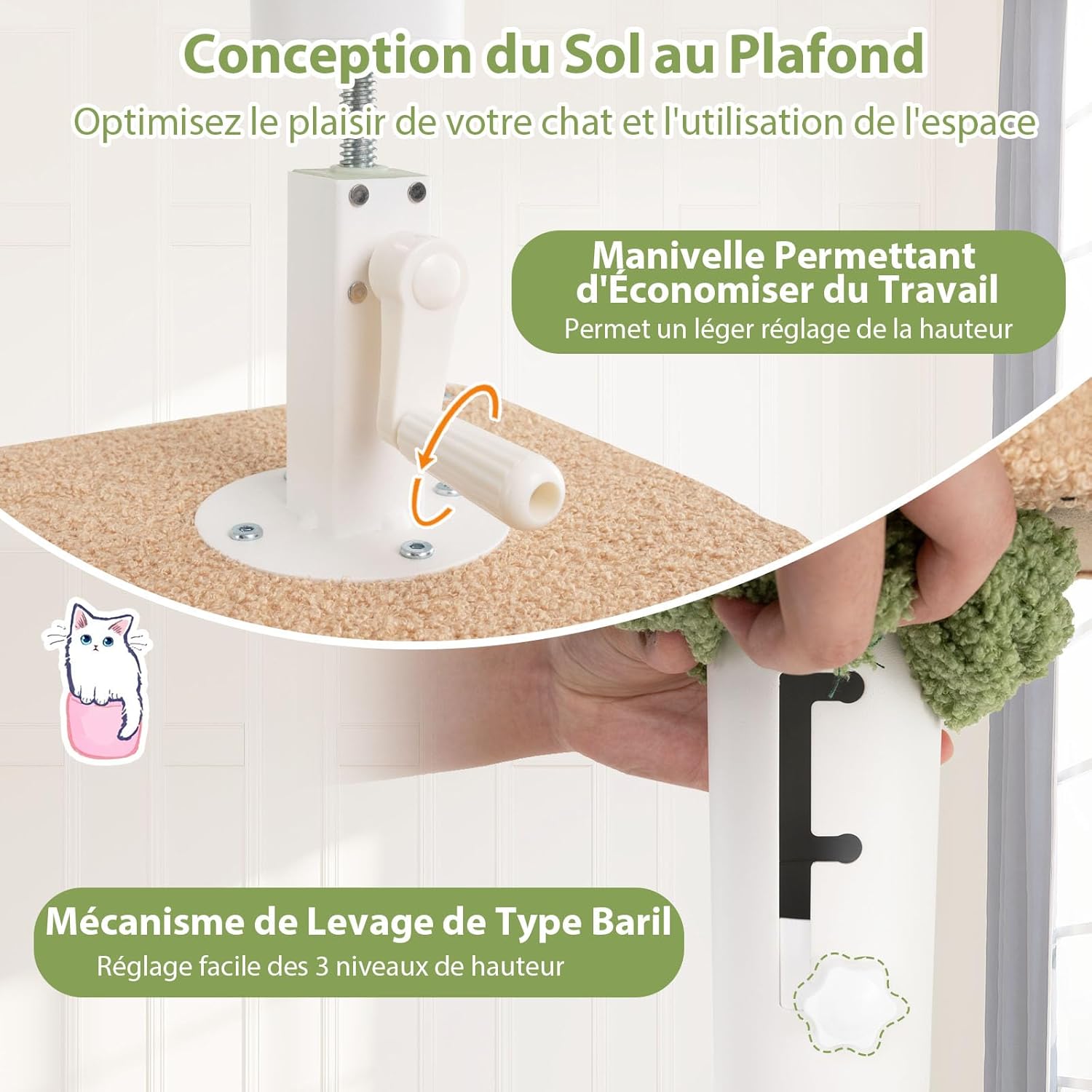 - Réglage de la Hauteur Flexible : Dotée d'une tige d'extension en métal, cette tour à chat haute peut être facilement ajustée de 218 à 253 cm à l'aide de la manivelle. De plus, 2 poteaux remplaçables de différentes hauteurs sont adaptés pour des hauteurs de plafond variées. De plus, le mécanisme de levage à 3 niveaux permet un ajustement précis à la hauteur souhaitée.
