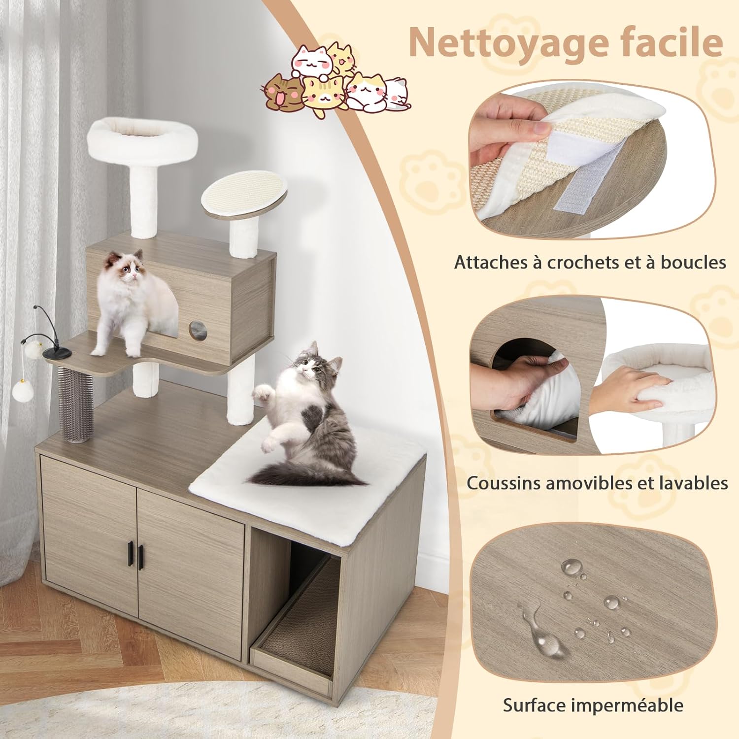 - Confort supérieur et nettoyage facile : 2 coussins moelleux, doux et confortables au toucher sont fixés par des attaches auto-agrippantes, faciles à retirer et à nettoyer. Le compartiment du bac à litière est facilement accessible pour le nettoyage, assurant ainsi un environnement hygiénique pour les chats.