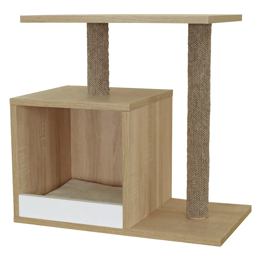 OOGarden relooke l'un de ses best-sellers en lui donnant une déclinaison design. L'arbre à chat Roméo donnera à votre animal préféré une cachette sympathique, 2 poteaux à griffer ainsi qu'une plateforme pour s'allonger. Multi-usages: à la fois arbre à chat, maison pour chat et griffoir Dimensions de la base: 58x34 cm Hauteur : 54 cm Couleur : marron 1 niche et 1 grande plateforme 2 poteaux à griffer Matériaux : bois