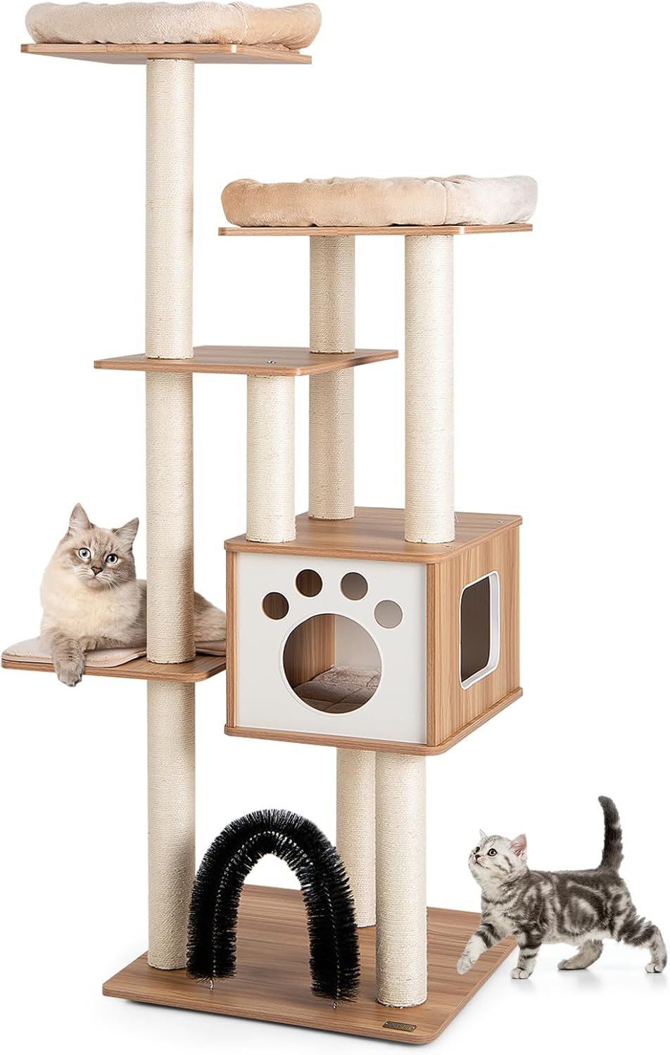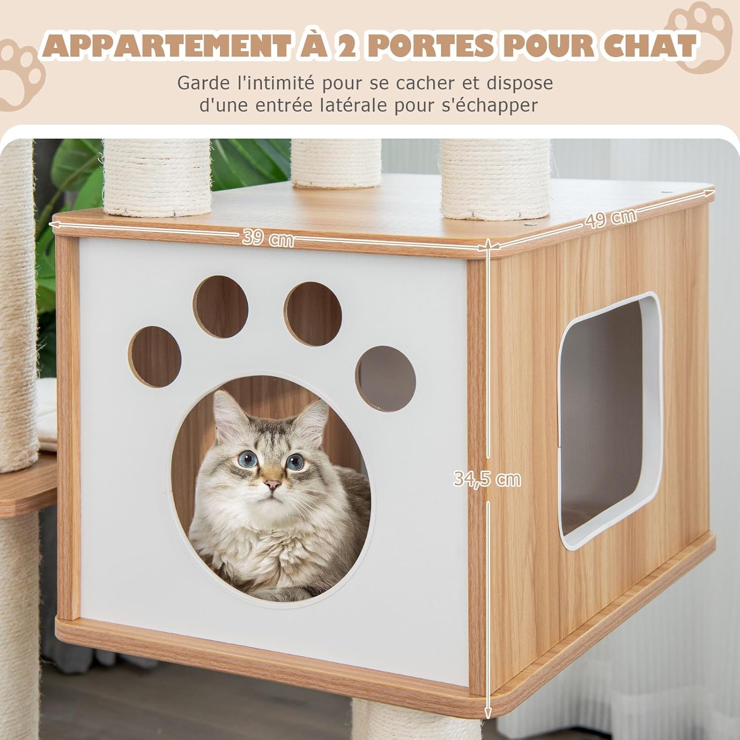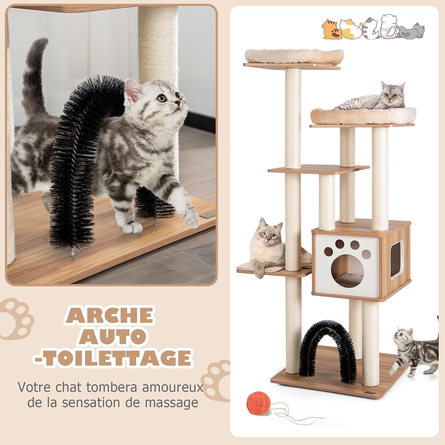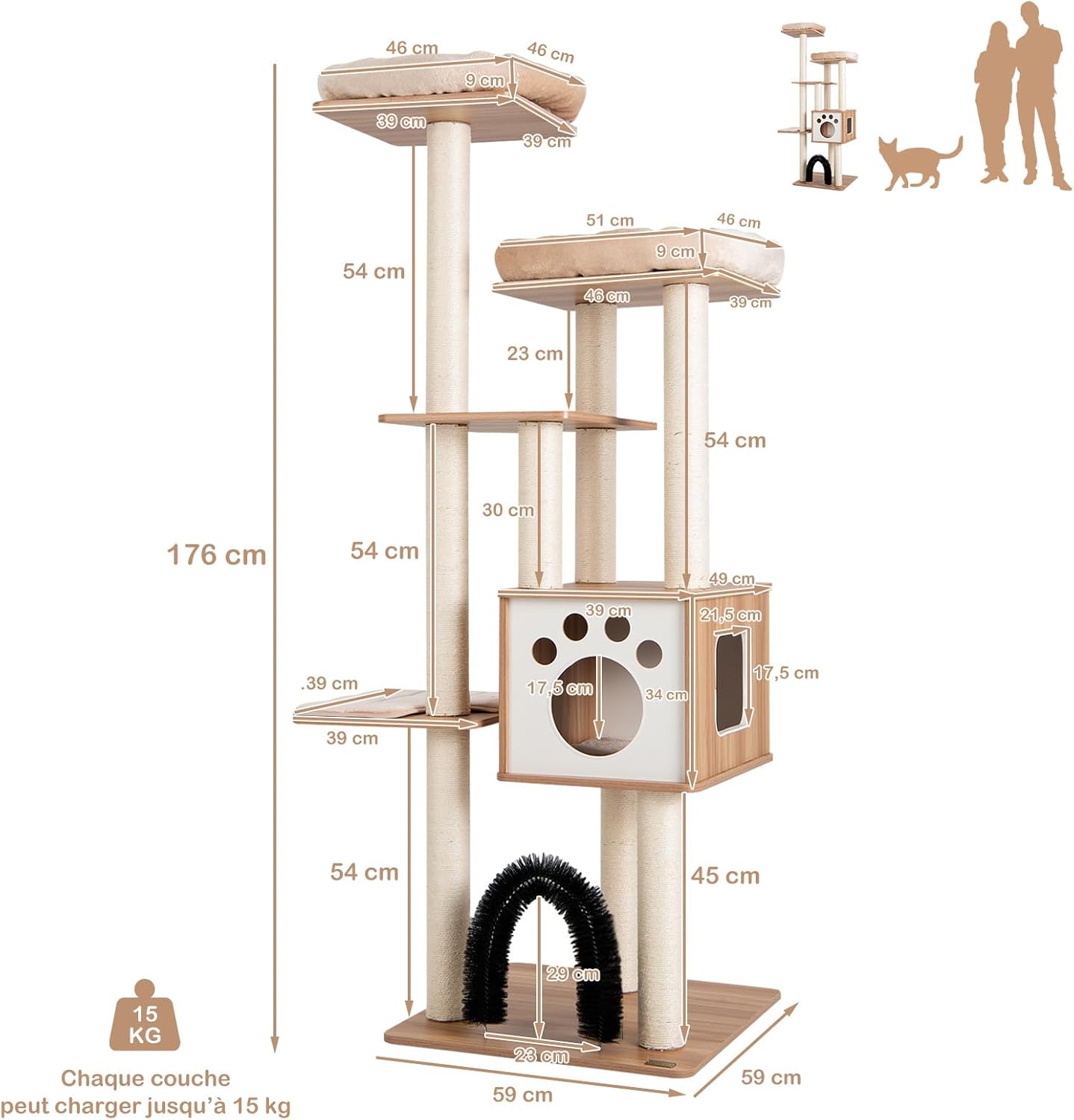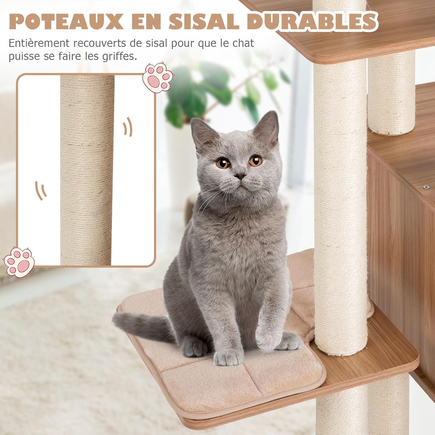 - Arbre à Chat Geant: Conçu avec 176 cm de haut, 5 niveaux et un niche confortable, l’arbre à chat convient pour 5 chats.