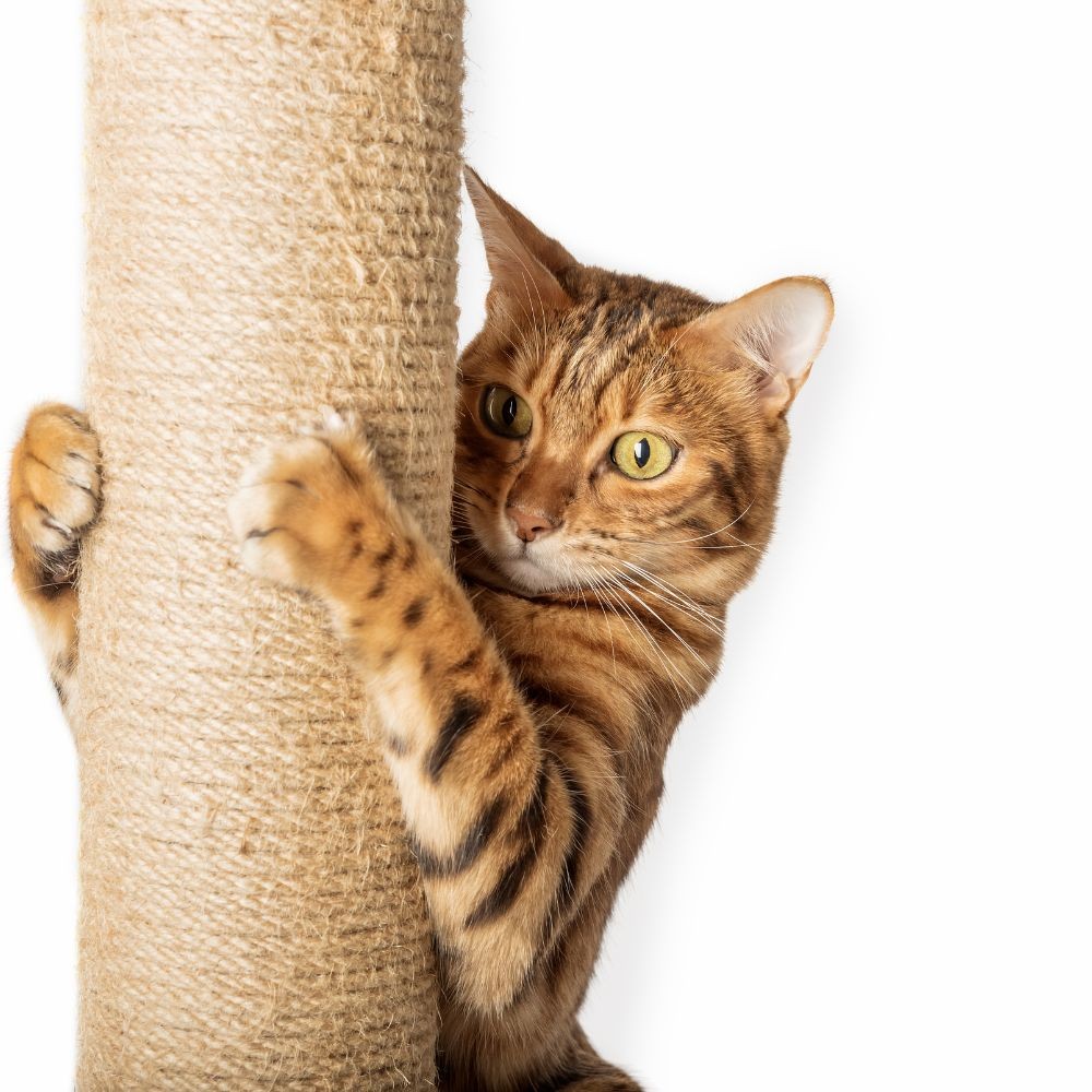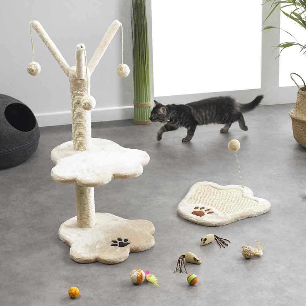Cet arbre à chat offre un design original en forme de patte. Il est recouvert d'une peluche douce et confortable.