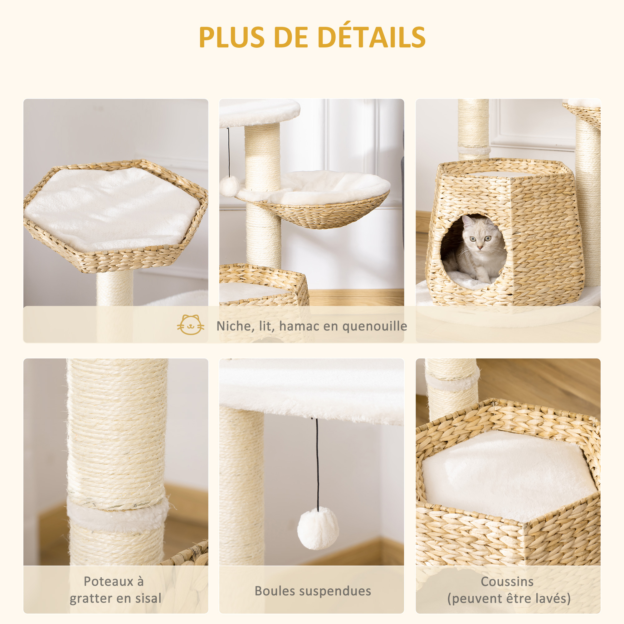 Ce splendide arbre à chats style cosy chic mélant les revêtements en quenouille tressée, sisal naturel et peluche courte apportera une touche d'originalité et d'élégance supplémentaire à votre intérieur. Doté de griffoirs, d'une niche, de 2 paniers (dont un d'observation), d'un jeu de 2 boules suspendues et de 3 coussins, votre chaton ou chat pourra se reposer, développer et s'épanouir pleinement !