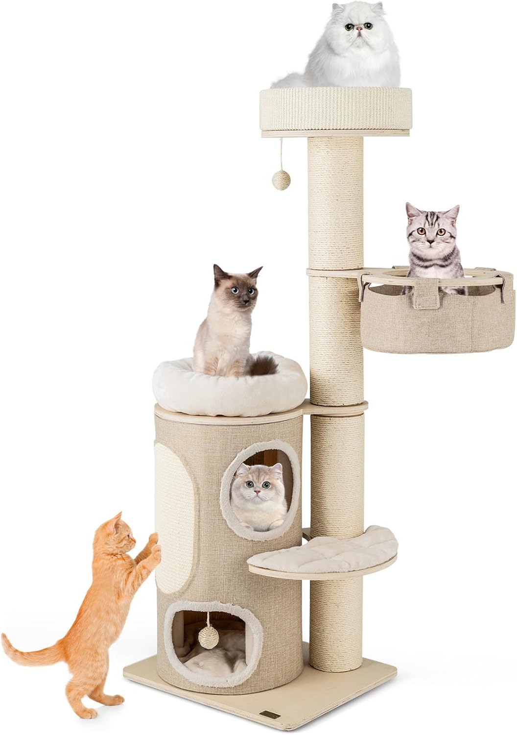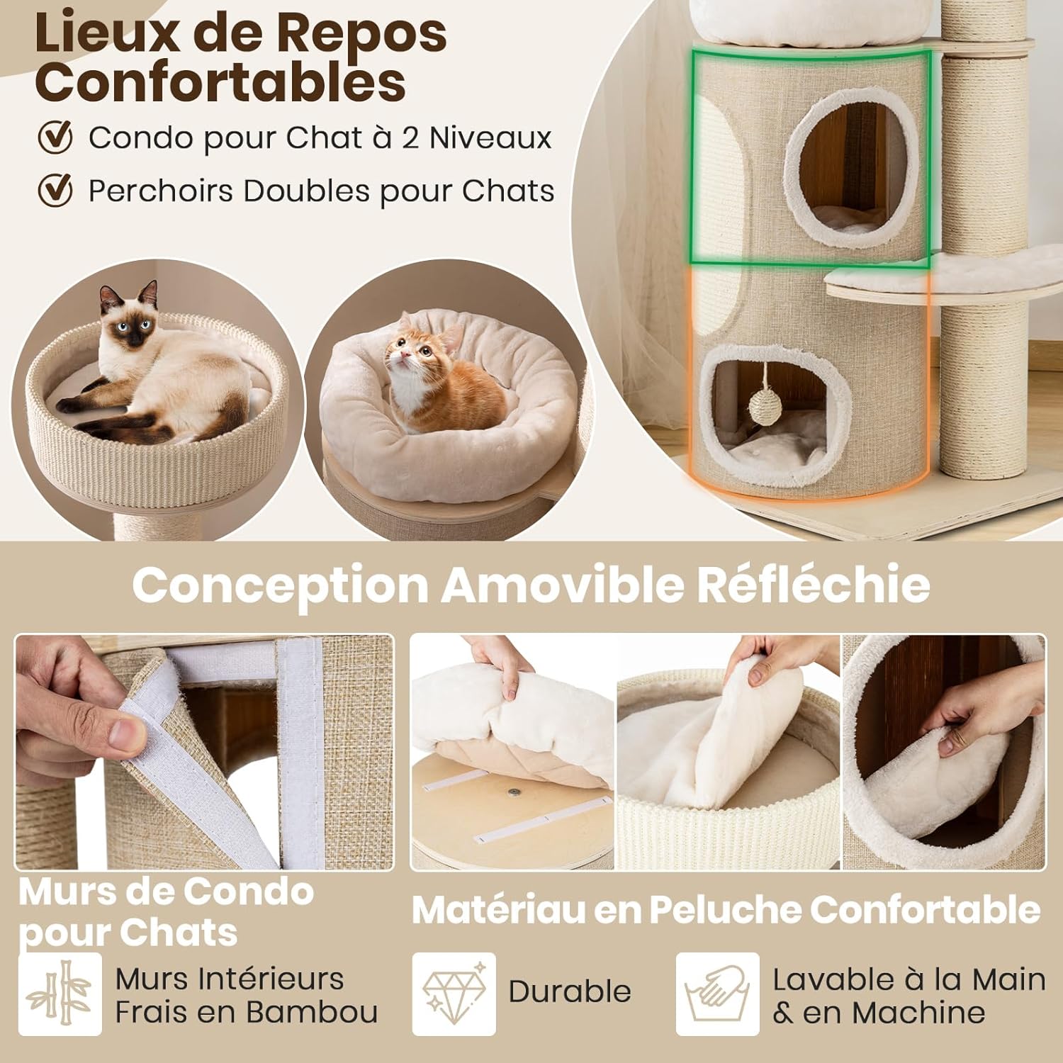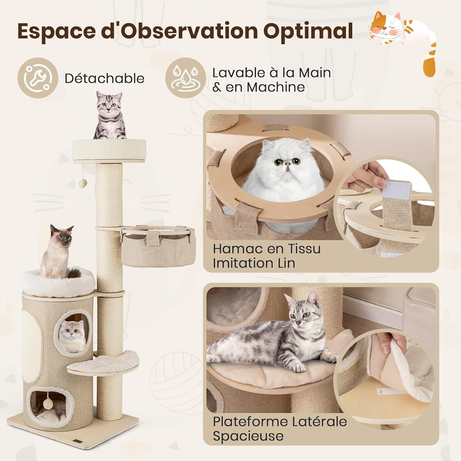 - Confort Optimal et Espace économisant : Notre arbre à chat xxl, offre un condo à deux étages, deux perchoirs et un hamac en tissu faux lin, où vos chats peuvent observer ou faire des siestes sereines sur des tapis pelucheux. Son design vertical utilise l'espace de sol en plafond, parfait pour les petits appartements.