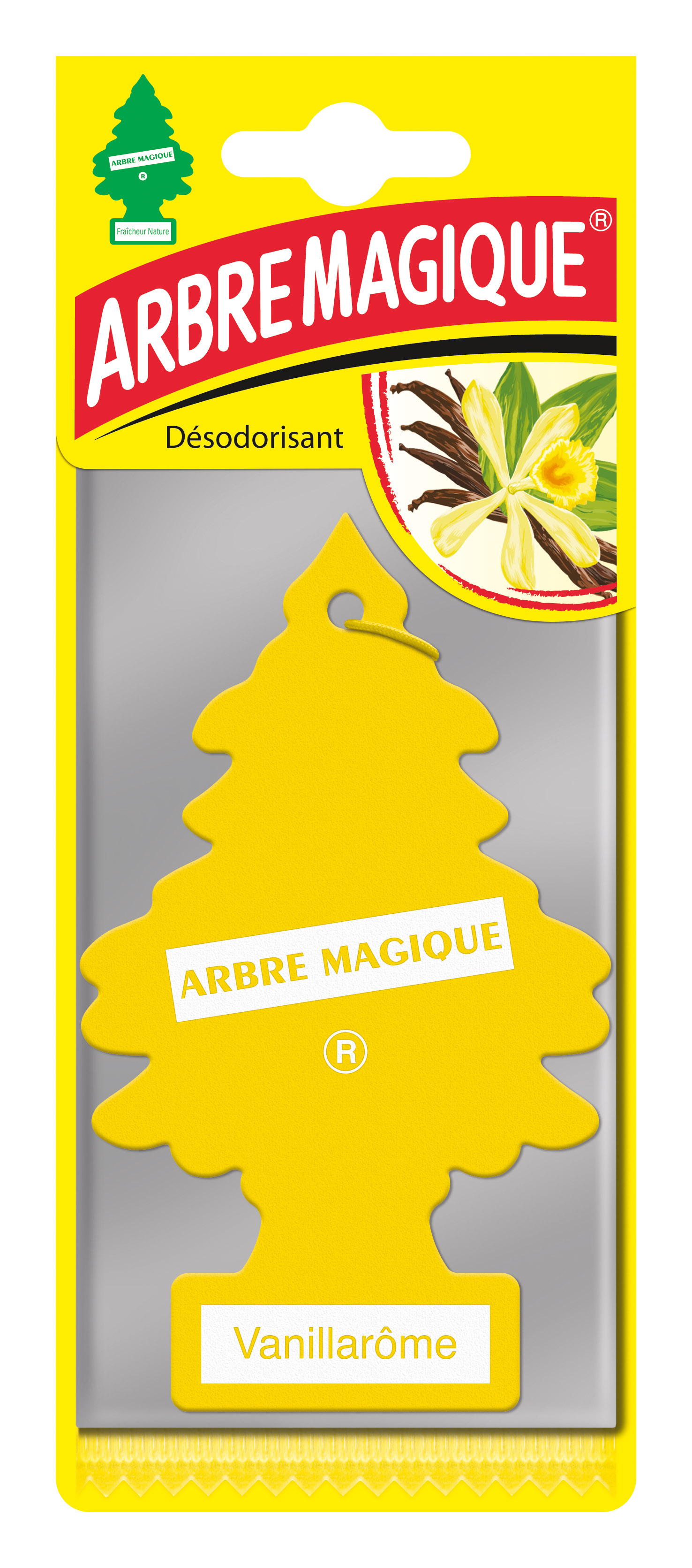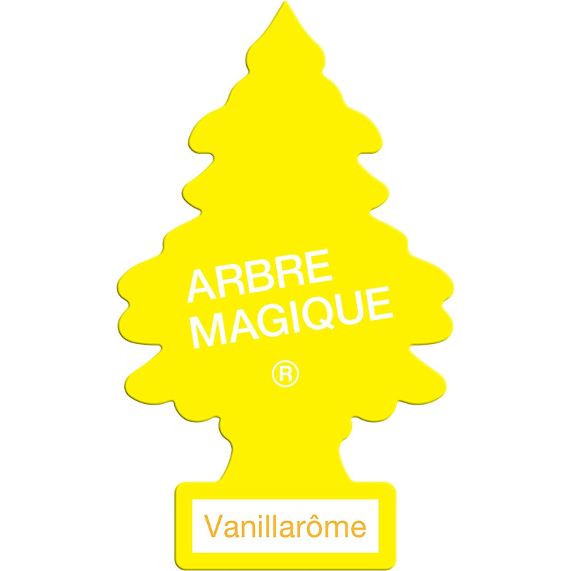 ARBRE MAGIQUE VANILLAROME Carte parfumée du plus mythique des sapins, à suspendre par un élastique au rétroviseur. Sapin jaune parfumé à la vanille.