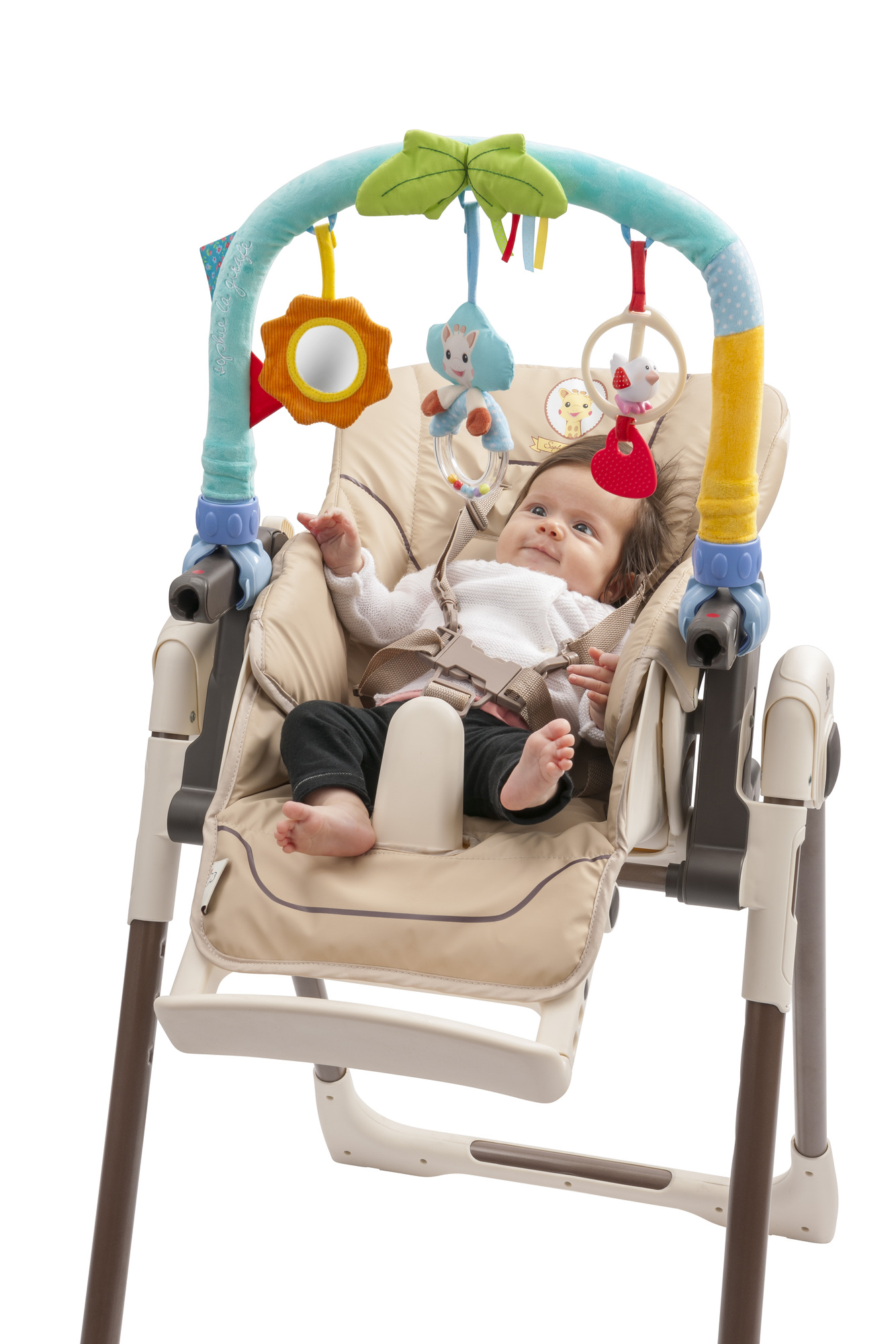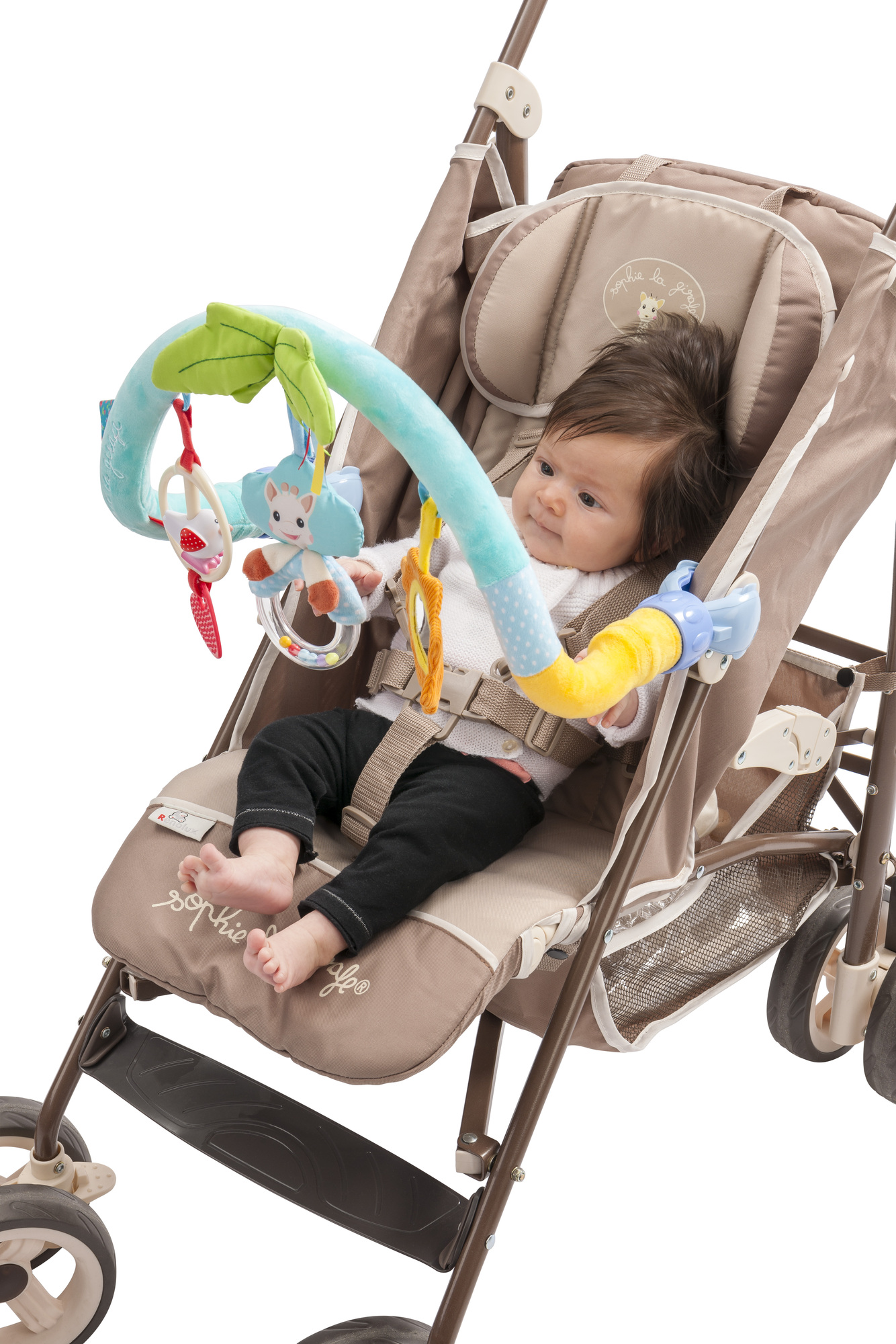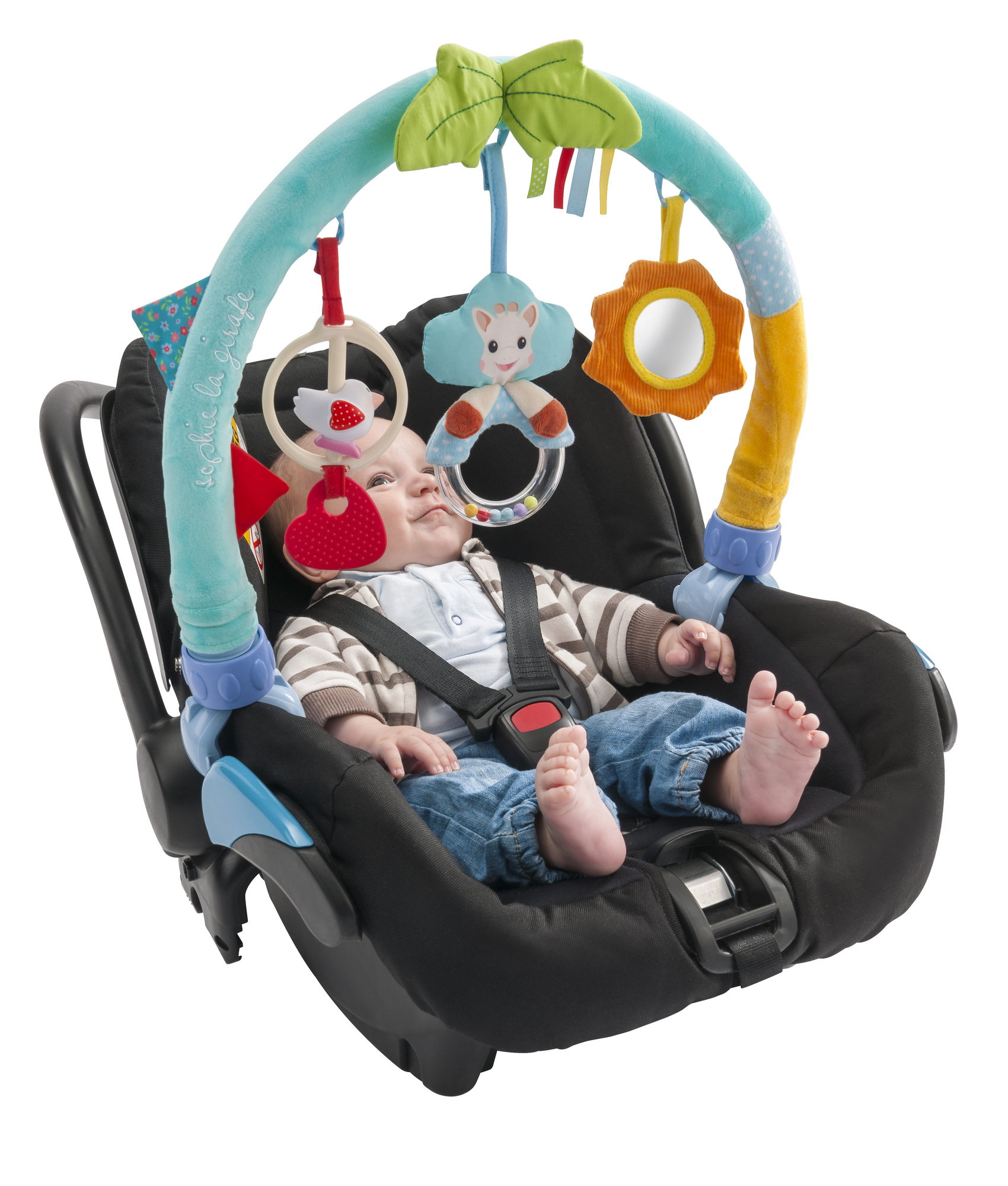 Une arche d'activités nomade, fixable sur tous types de supports grâce à ses pinces universelles! (transat, cosy, poussettes, siège auto...) A découvrir: - un hochet à l’effigie de Sophie la girafe avec des billes colorées - un anneau de dentition - kiwi l'oiseau à faire tournoyer - un miroir pour voir son reflet - des étiquettes au bruit de papier froissé à manipuler