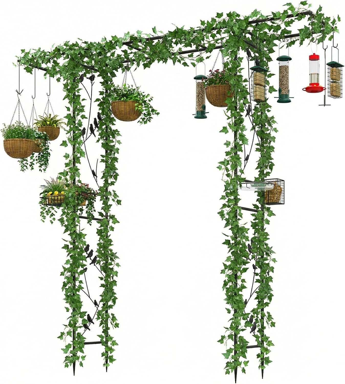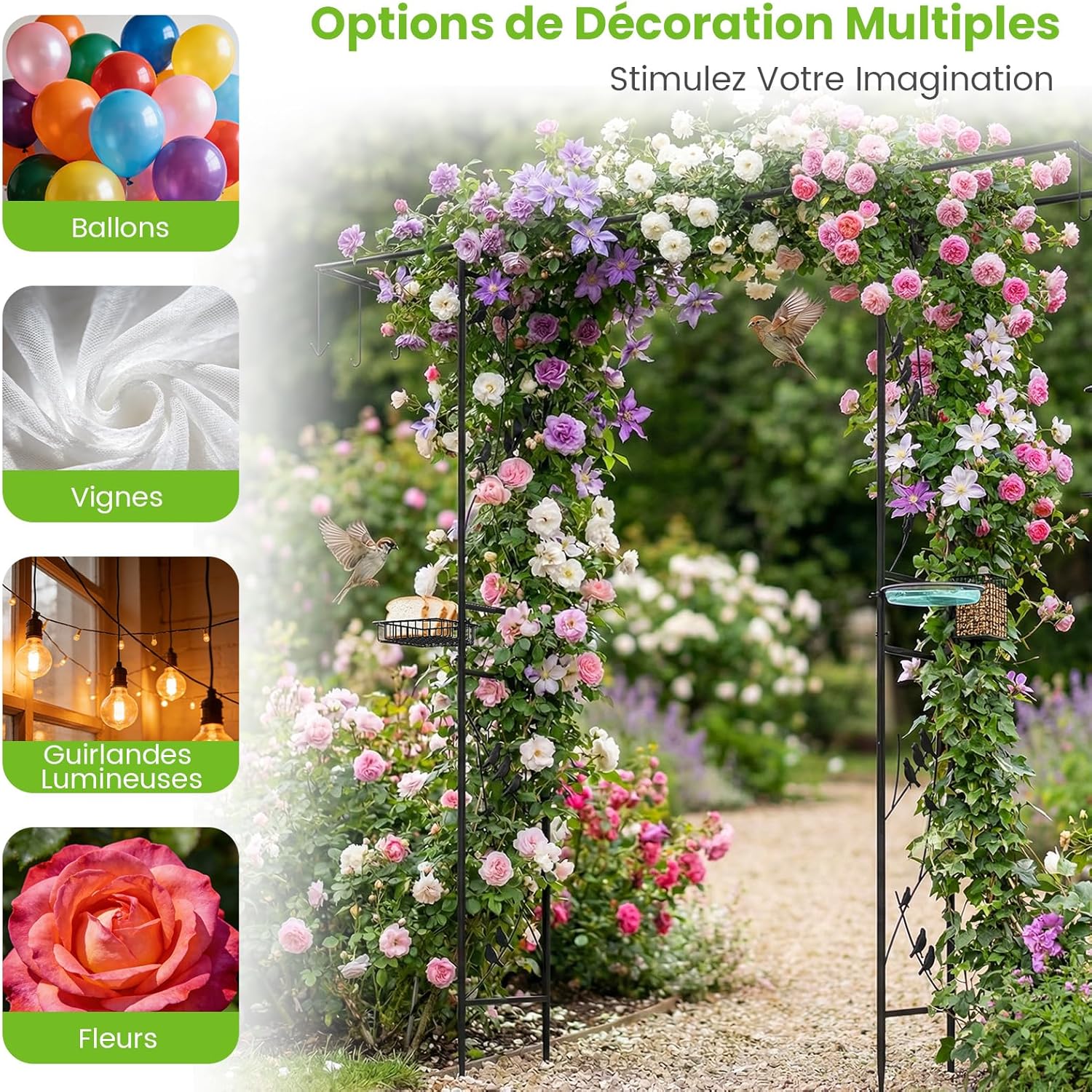 - Multiples options de décoration:Équipée de 7 crochets polyvalents, l'arche métallique de jardin vous permet d'exposer lanternes, paniers suspendus ou mangeoires pour les oiseaux visiteurs. Ces crochets peuvent être placés selon vos souhaits. De plus, le sommet plat étendu peut être décoré avec des ballons ou des vignes pour un aspect charmant.