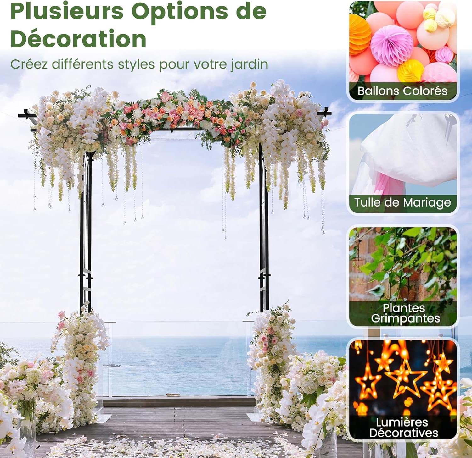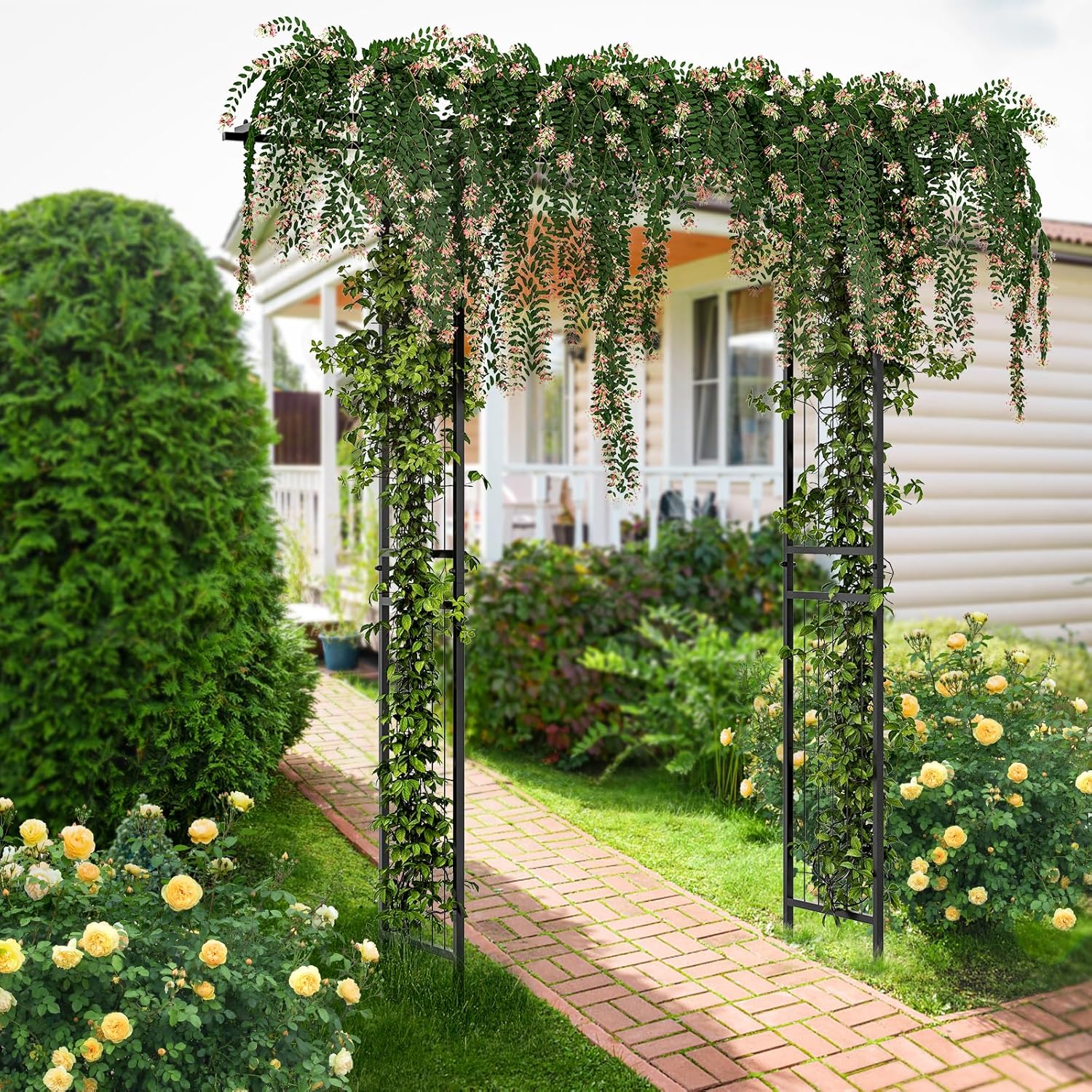 - Plusieurs options de décoration:Cette arche et treillis d'extérieur vous permet de cultiver des plantes grimpantes, telles que le lierre, la clématite, la vigne, la gloire du matin, etc. En outre, vous pouvez la décorer avec des ballons colorés, du tulle de mariage, des lumières décoratives, créant ainsi différents styles pour votre jardin.