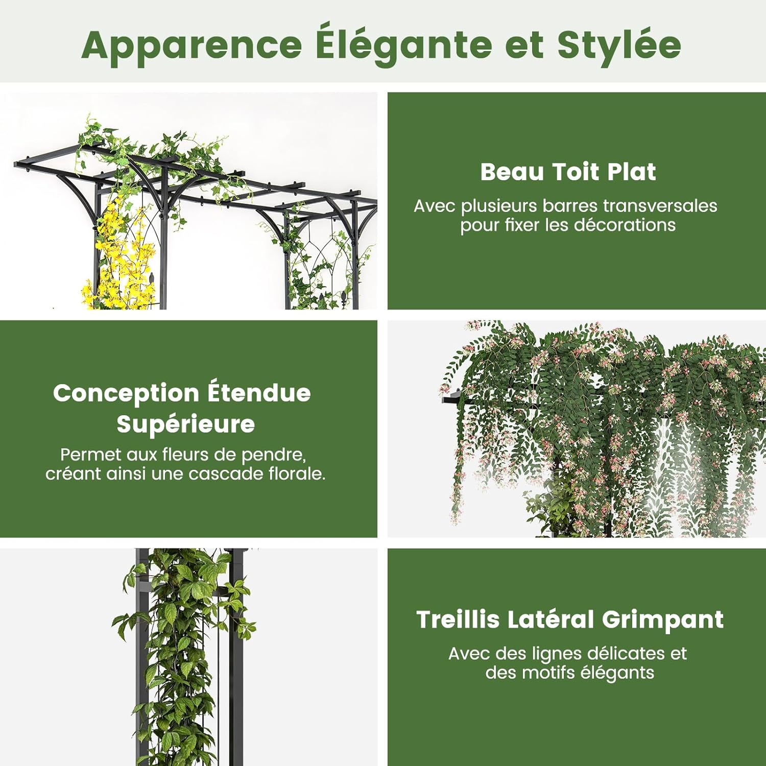 - Apparence élégante:L’arche de jardin comporte des treillis grimpants latéraux avec des lignes délicates et des motifs élégants, qui pourraient ajouter un point attrayant à votre cour. De plus, la conception supérieure étendue permet aux fleurs de grimper, créant ainsi une cascade florale.
