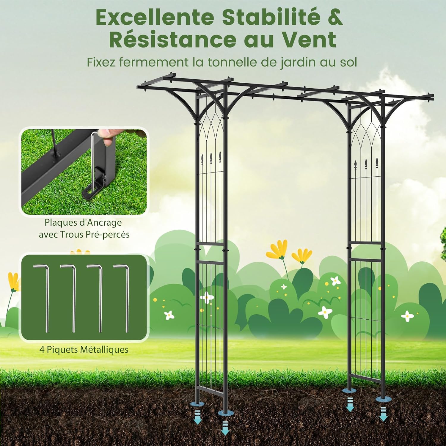 Les plaques d'ancrage et les 4 piquets métalliques fixent solidement l’arche de jardin au sol