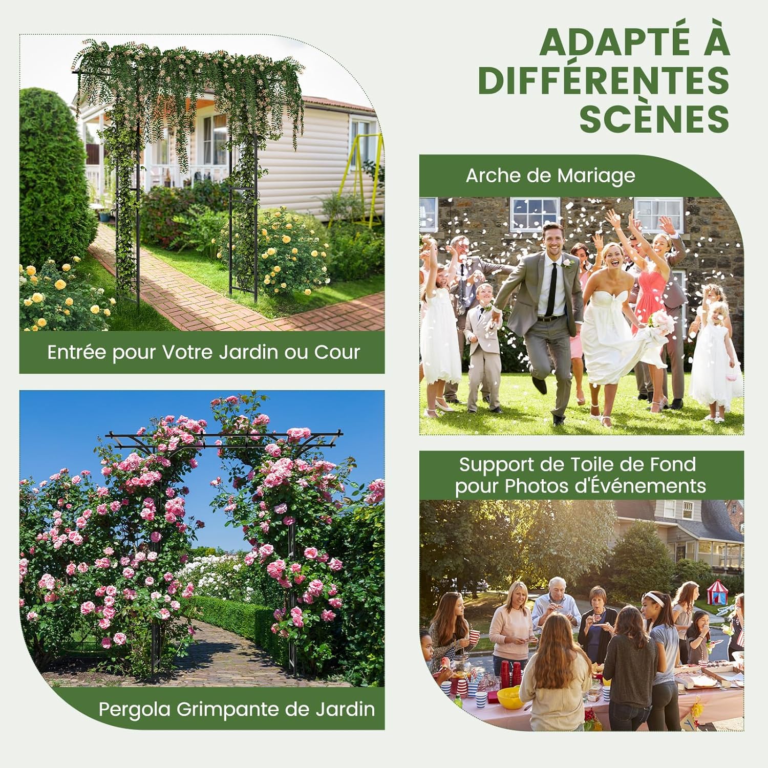 - Application polyvalente:Qu'elle soit utilisée comme entrée de votre jardin ou cour, support de plantes grimpantes, belle arche de mariage ou support de toile de fond pour photo d'événement, cette arche de jardin en métal s'adapte facilement à divers paramètres et fonctions.