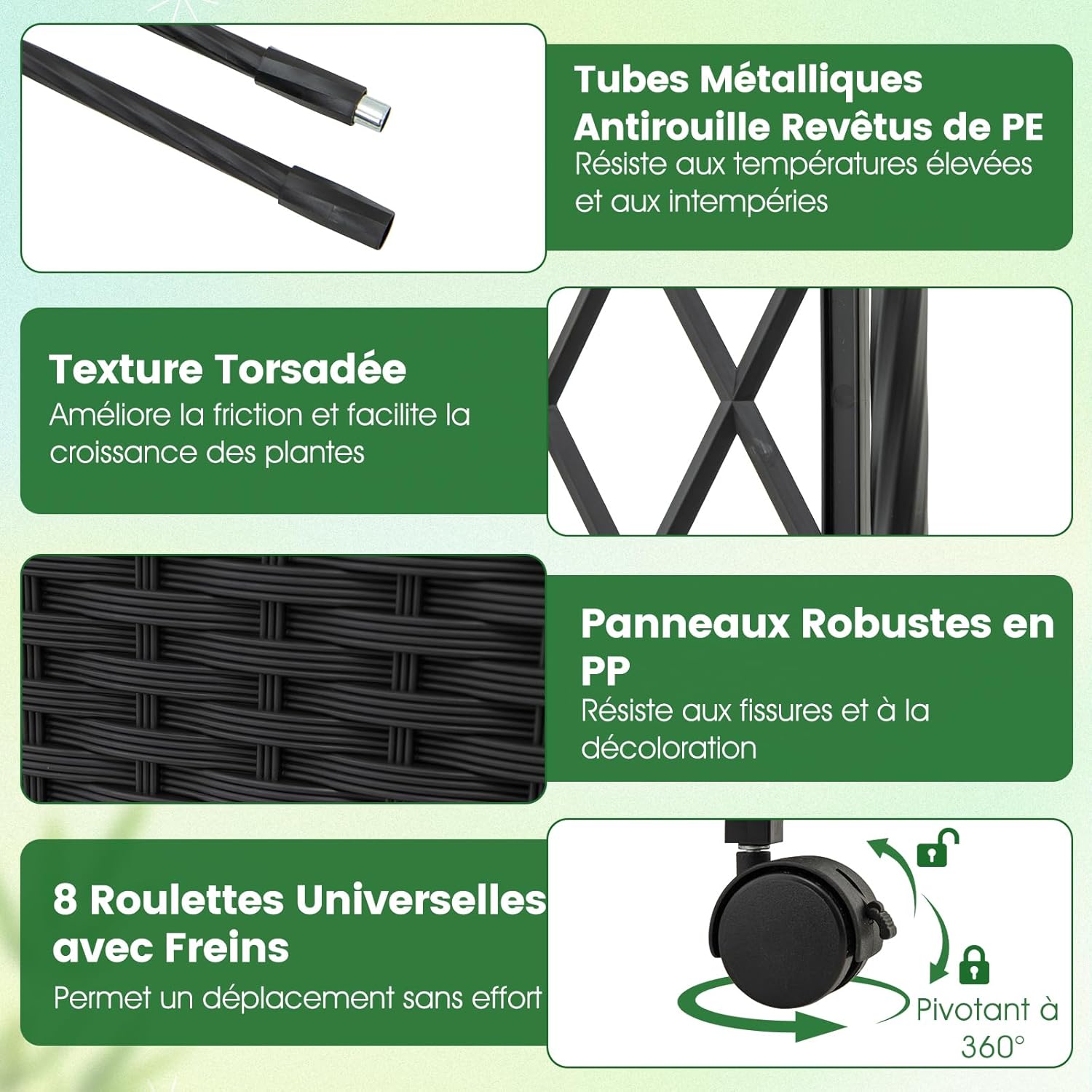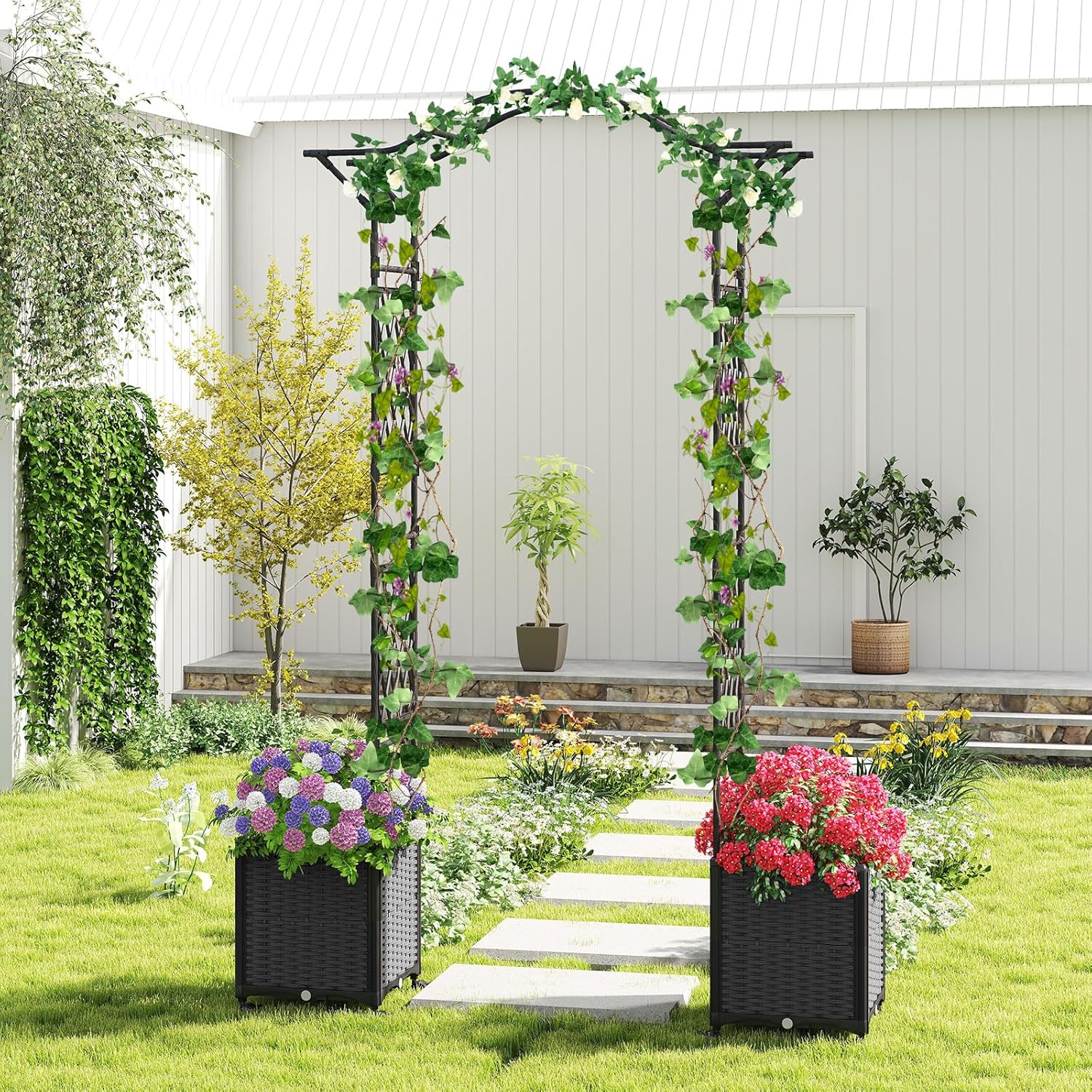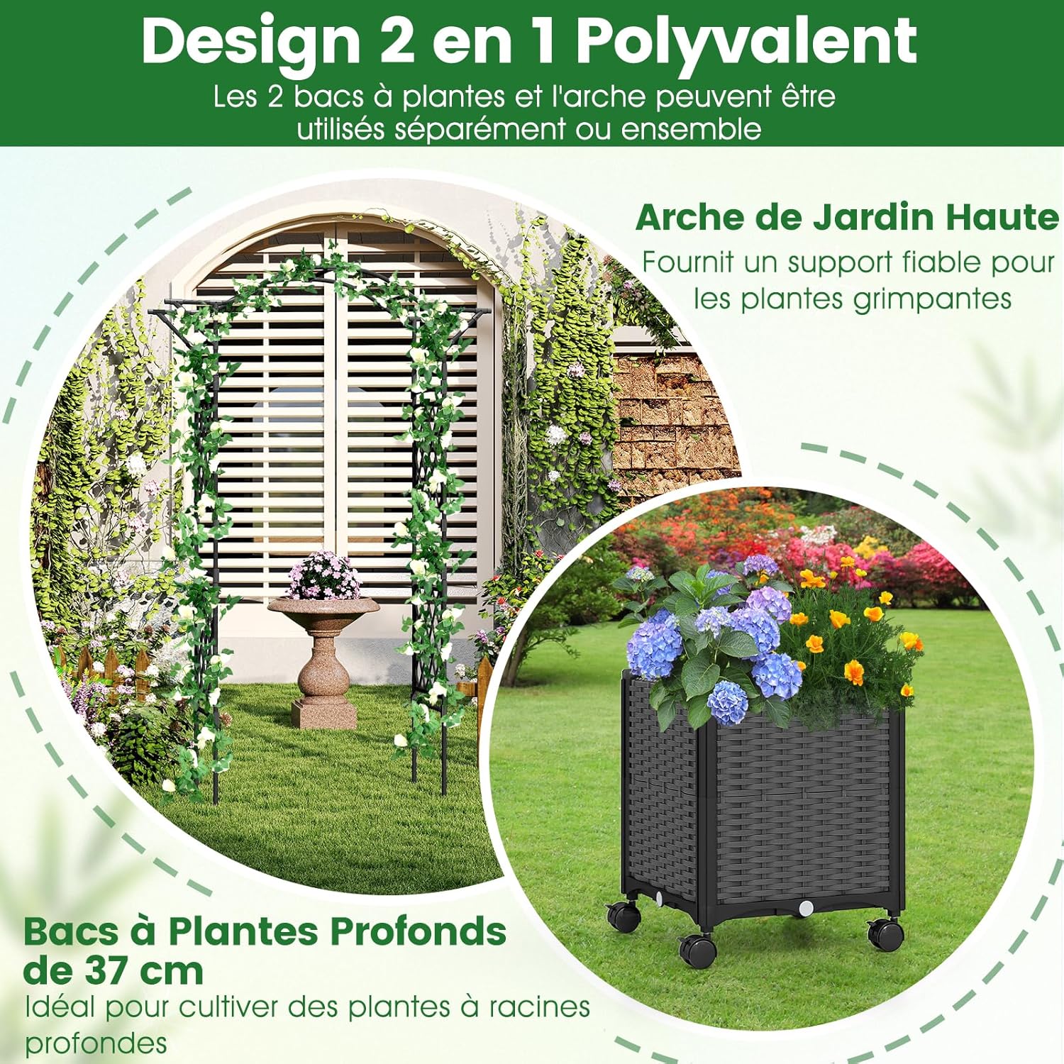 [ Mobilité facile ] Les jardinières sont équipées de 8 roues verrouillables pour faciliter le déplacement et le placement sécurisé n'importe où dans votre jardin. Plus qu'une pergola de jardin grimpante, elle sert également de superbe arche de mariage ou d'entrée élégante pour votre jardin et votre cour, ajoutant une touche d'élégance.