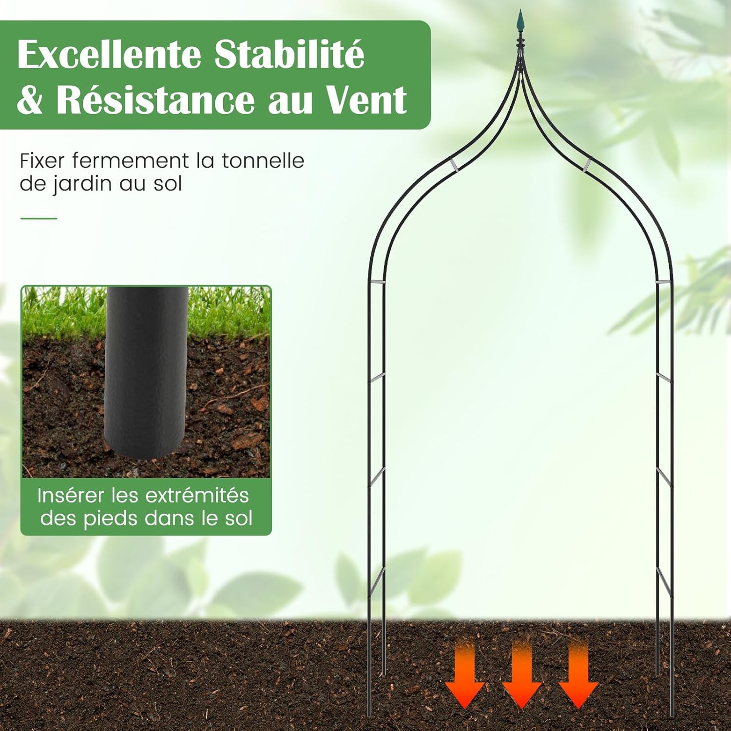 - Construction robuste et fiable:L'arche de jardin est construite à partir de tubes métalliques revêtus de poudre antirouille, conçus pour résister aux éléments. De plus, les extrémités des 4 pieds métalliques peuvent être insérées dans le sol, assurant ainsi une excellente stabilité et résistance au vent.