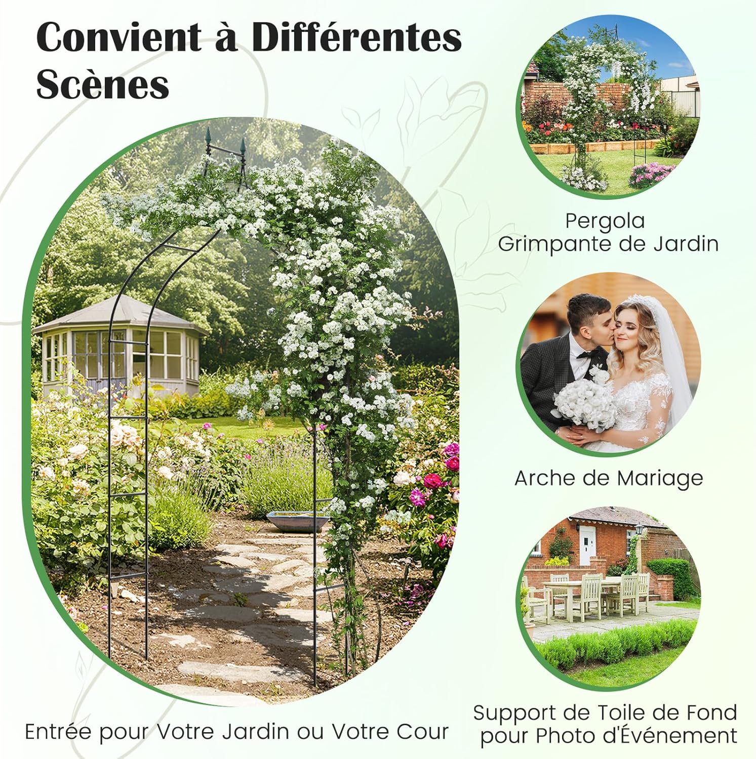 - Application polyvalente:Qu'elle soit utilisée comme entrée de votre jardin ou cour, support de plantes grimpantes, belle arche de mariage ou support de toile de fond pour photo d'événement, cette treillis en arc de jardin en métal s'adapte facilement à divers paramètres et fonctions.