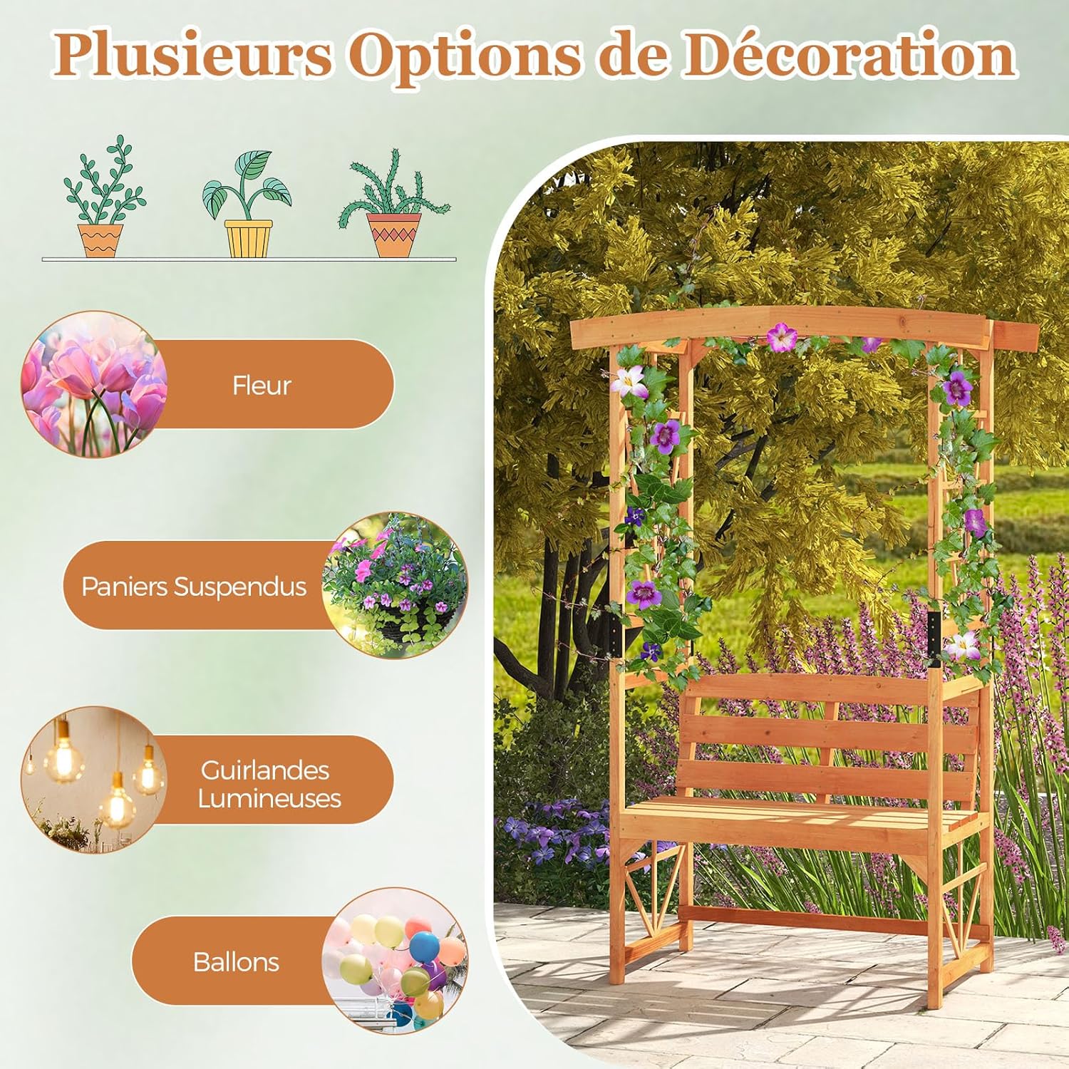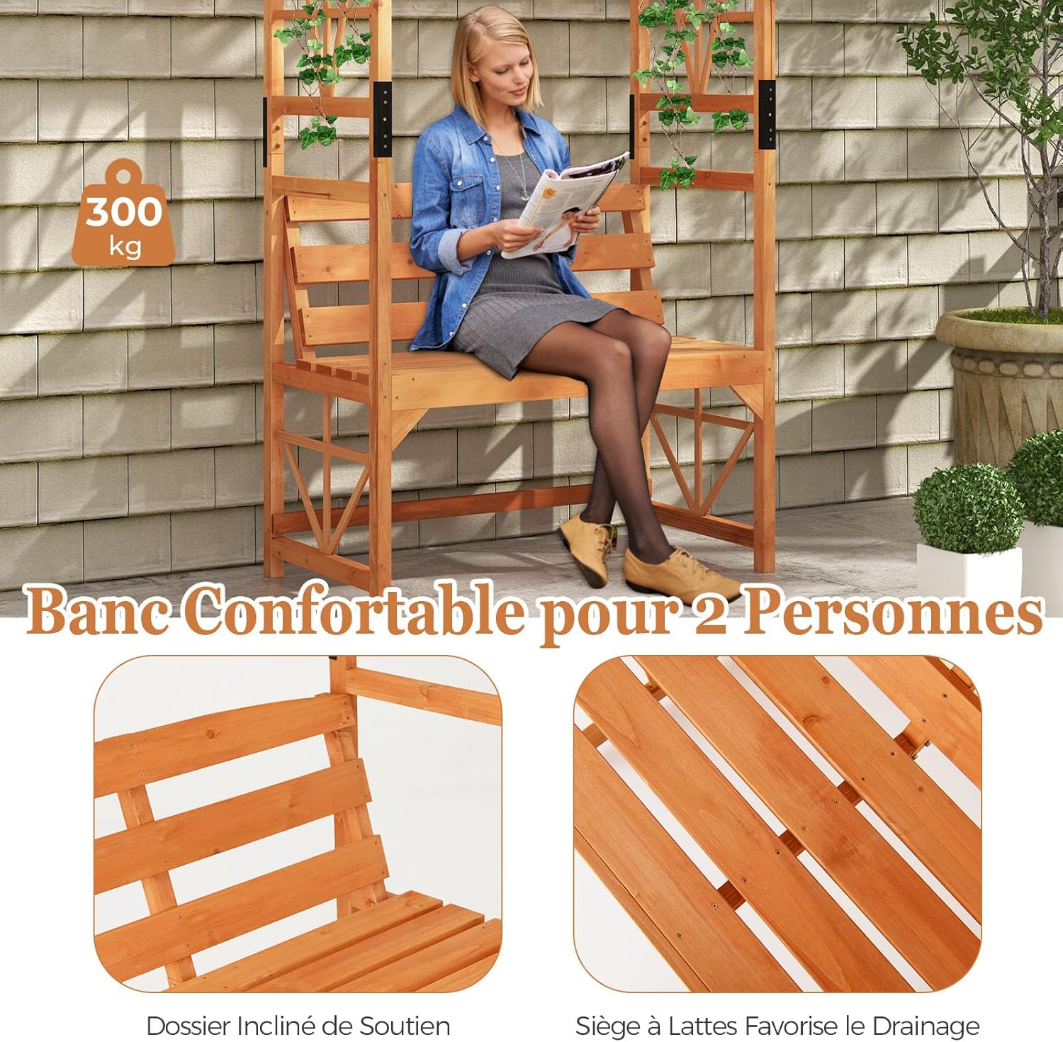 L'arche de jardin est dotée d'un banc intégré pour 2 personnes et conçue avec 2 treillis latéraux, offrant un espace pour que vos plantes grimpantes s'épanouissent, ajoutant une touche dynamique à votre jardin, arrière-cour ou terrasse. Le toit arqué et les barres allongées offrent des possibilités de personnalisation infinies, permettant de l'orner de ballons pour une occasion festive, de guirlandes lumineuses pour une ambiance romantique ou de tulle pour un mariage. Fabriqué en bois de sapin naturel et recouvert d'une peinture protectrice à base d'eau, elle est robuste et durable.