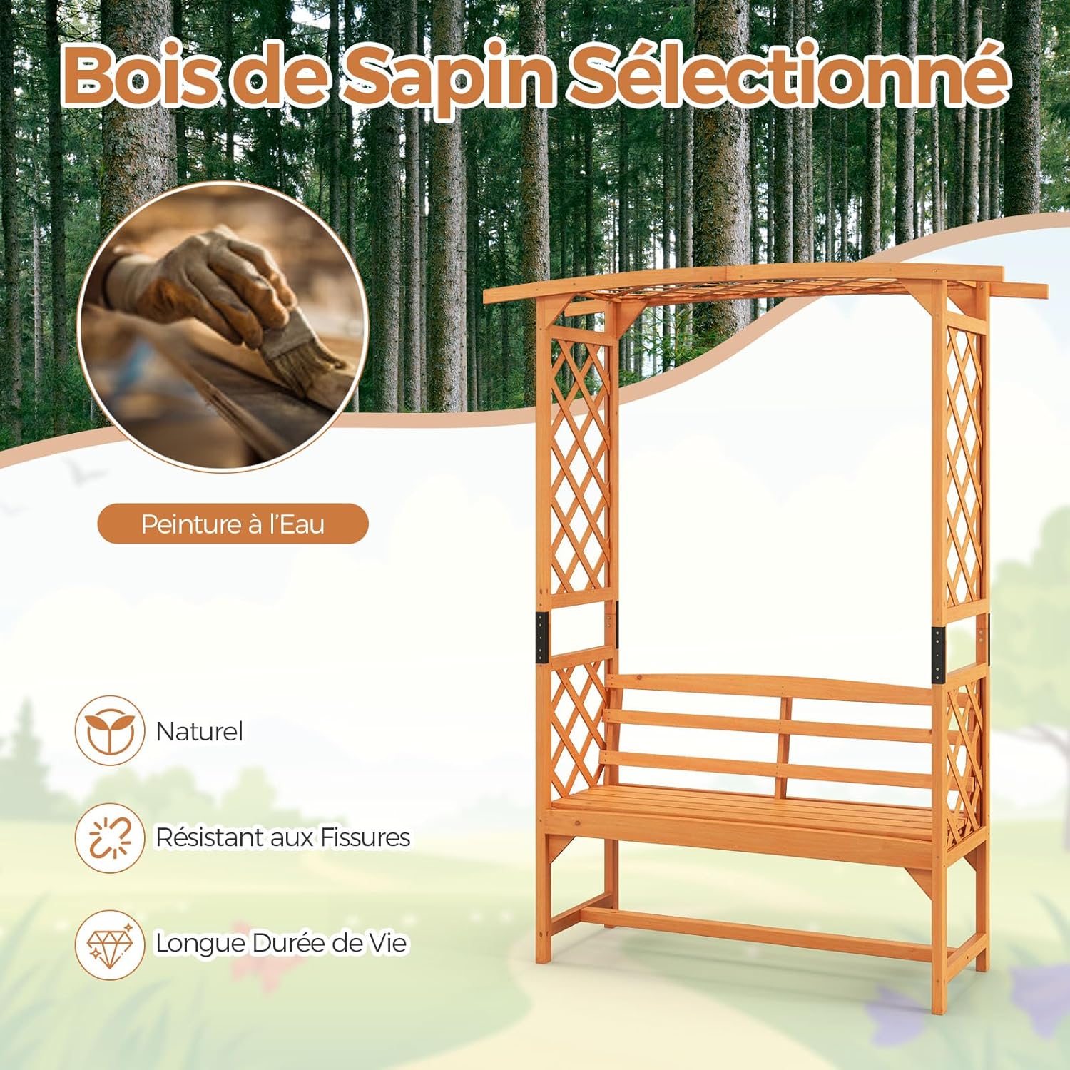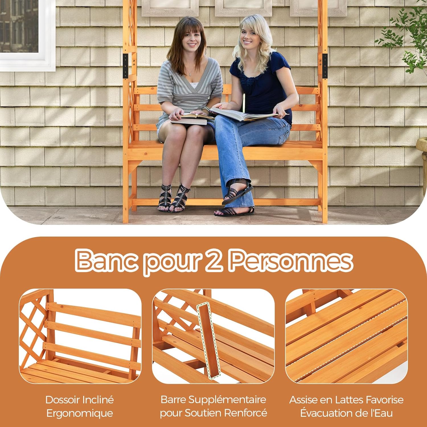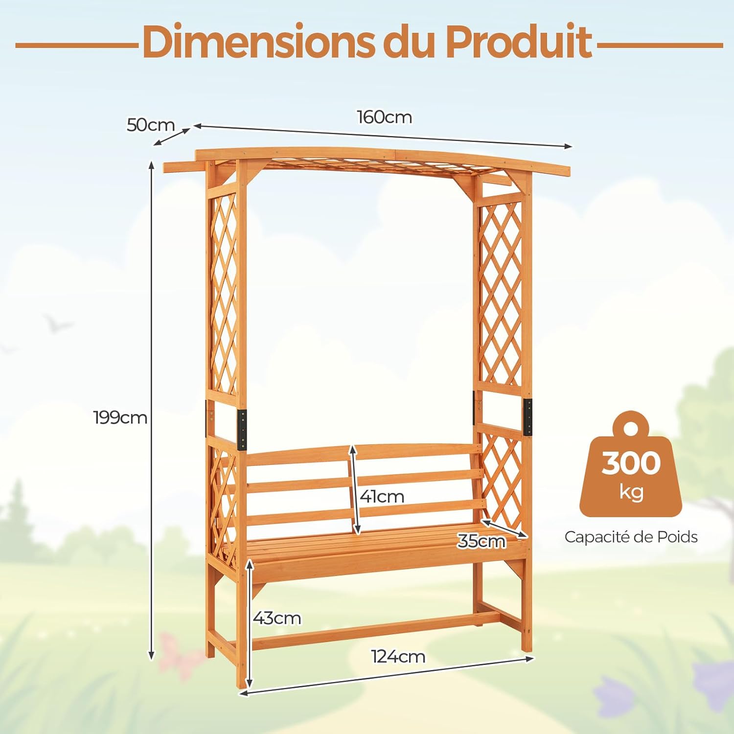 L'arche de jardin est dotée d'un banc intégré pour 2 personnes et conçue avec 4 treillis latéraux, offrant un espace pour que vos plantes grimpantes s'épanouissent, ajoutant une touche dynamique à votre jardin, arrière-cour ou terrasse. Le toit arqué et les barres allongées offrent des possibilités de personnalisation infinies, permettant de l'orner de ballons pour une occasion festive, de guirlandes lumineuses pour une ambiance romantique ou de tulle pour un mariage. Fabriqué en bois de sapin naturel et recouvert d'une peinture protectrice à base d'eau, elle est robuste et durable.
