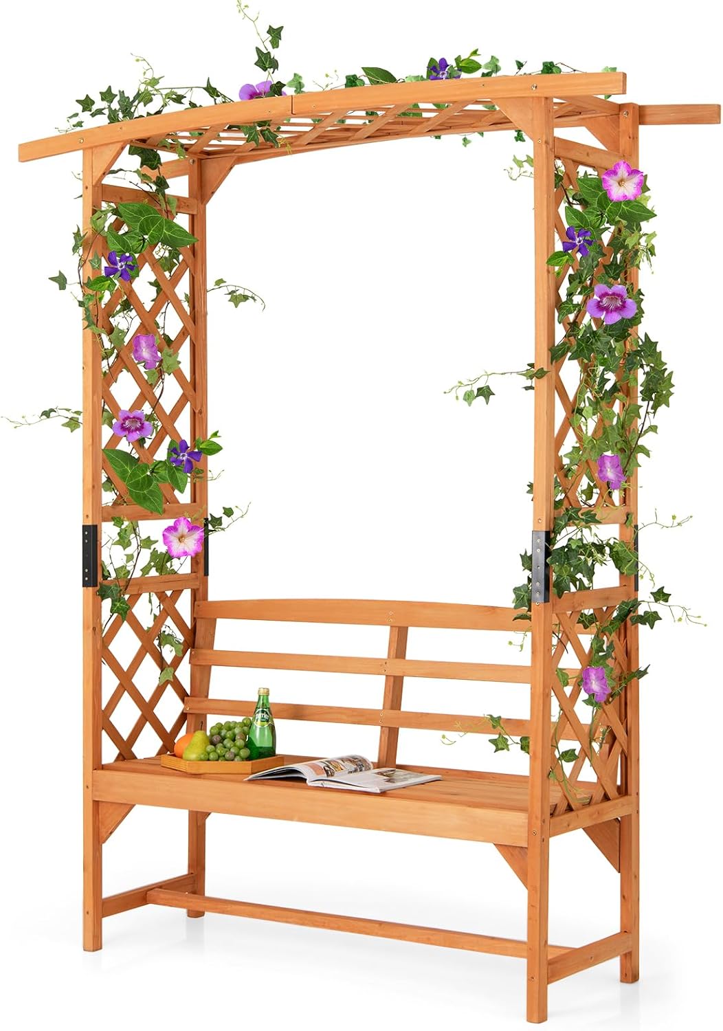 Arche jardin avec banc exterieur, banc et 2 treillis pour plantes grimpantes, vignes
