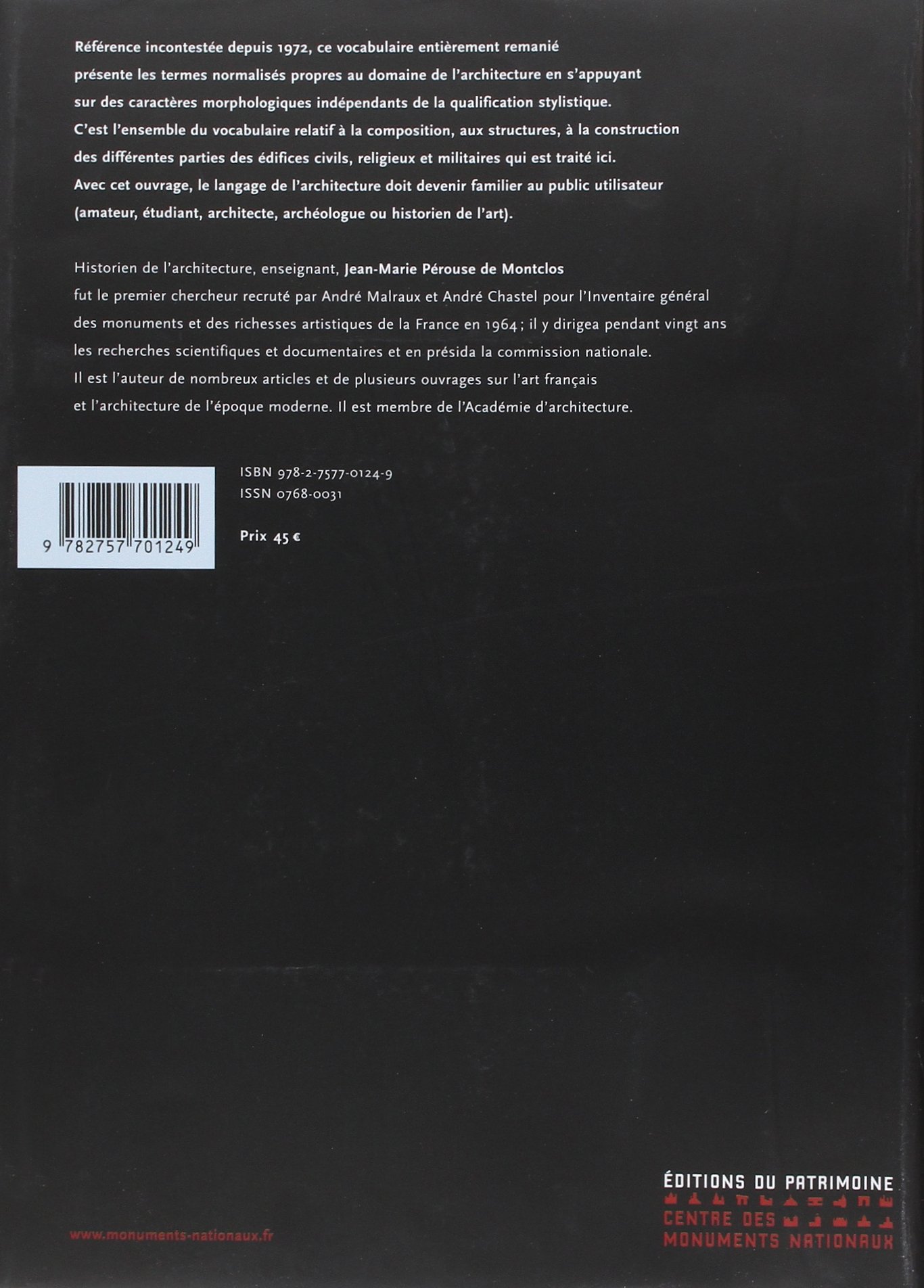Fleuron de la collection, Architecture, méthode et vocabulaire de Jean-Marie Pérouse de Montclos fait autorité en la matière, depuis sa première édition en 1972. Unique au monde, il fait aujourd¿hui l¿objet d¿une nouvelle édition avec un texte revu et enrichi par l¿auteur. Une iconographie généreusement augmentée et ouverte à la couleur permet d¿établir une relation étroite entre le texte et l¿image, tandis que l¿appareil de notes précise les références historiques et bibliographiques. Plus de 1 200 illustrations figurent les quelque 1 200 termes d¿architecture définis dans les 3 grands chapitres de l¿ouvrage : le premier étant dédié au vocabulaire général (de la représentation à la construction), le suivant décomposant les différentes parties d¿un édifice (de ses fondations au décor en passant par les baies, les couvertures, les escaliers, etc.) et le dernier s¿attachant aux spécificités des édifices suivant leur typologie (religieux, public, militaire, etc.).