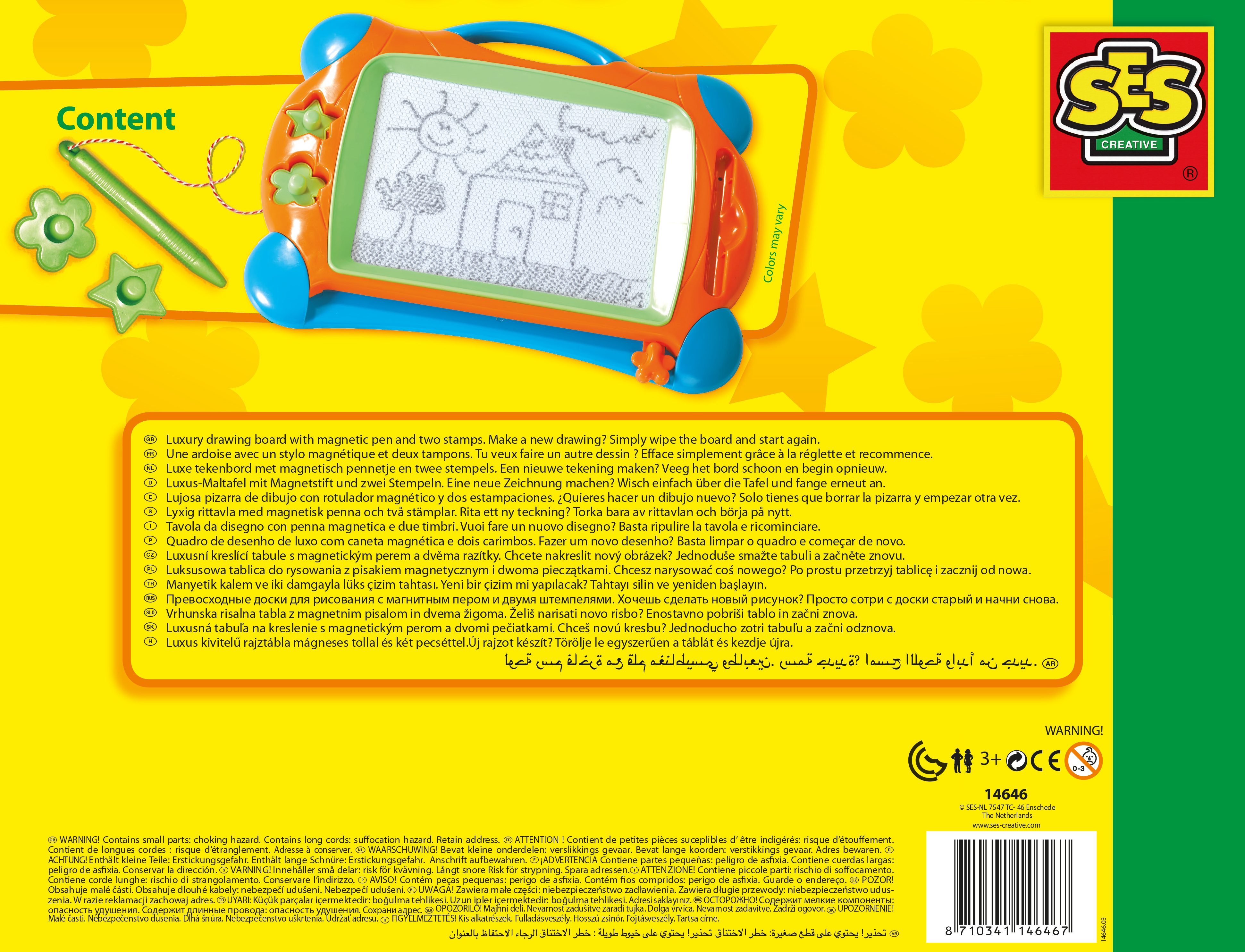 Réalise tes plus beaux dessins sur ce luxueux tableau à dessin magnétique SES. Dessine avec le stylo magnétique ou fais d’amusantes œuvres d’art avec les tampons. Tu veux faire un autre dessin ? Efface simplement le tableau et recommence. Le tableau à dessin est portatif et donc idéal pour partir en voyage !