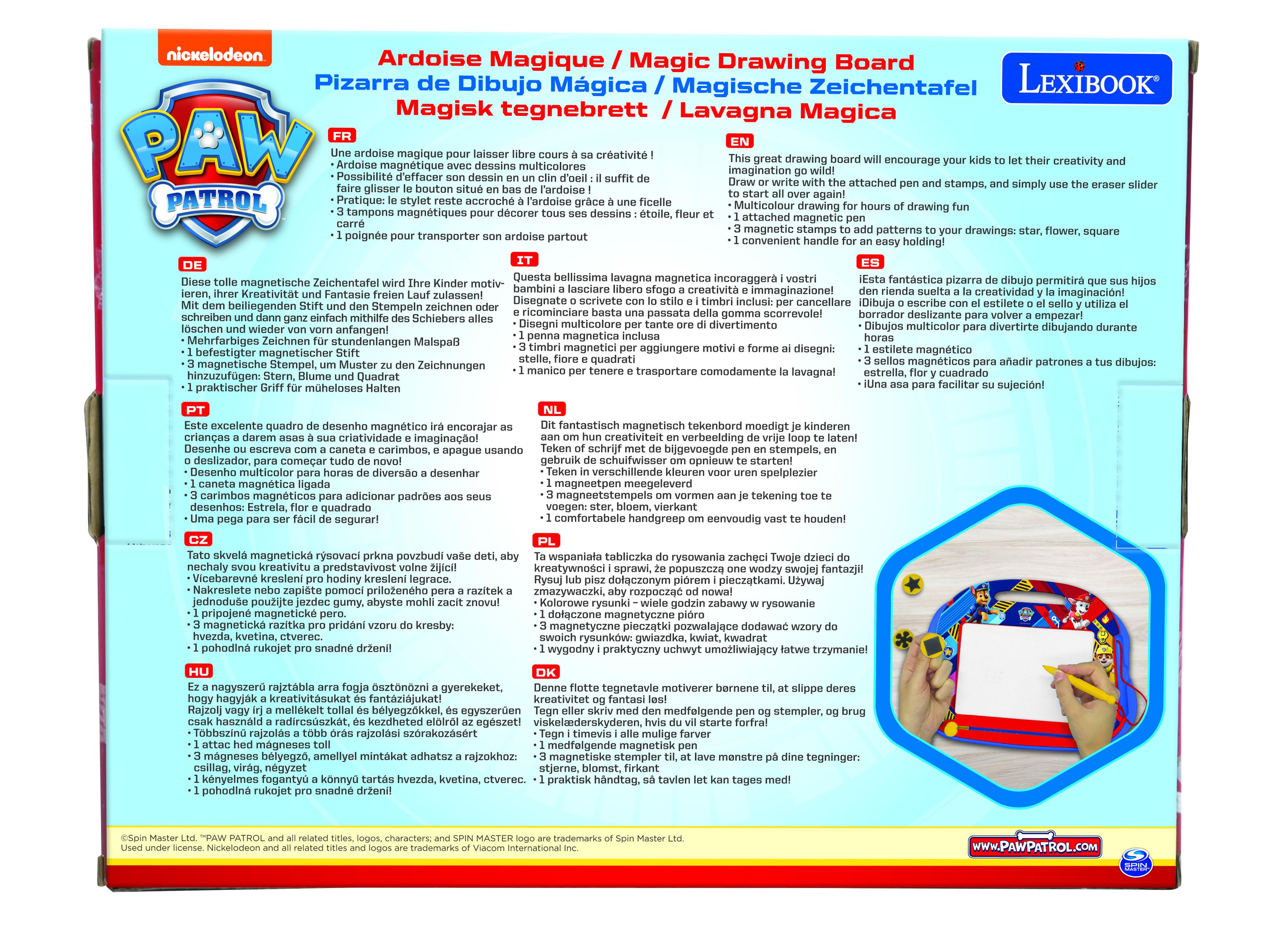* Une ardoise magique pour laisser libre cours à sa créativité ! * Un super design avec Chase, Marshall, Rubble et Skye ! * Ardoise magnétique avec dessins multicolores. * Possibilité d'effacer son dessin en un clin d'œil : il suffit de faire glisser le bouton situé en bas de l'ardoise ! * Pratique : le stylet reste accroché à l'ardoise grâce à une ficelle. * 3 tampons magnétiques pour décorer tous ses dessins : étoile, fleur et carré. * 1 poignée pour transporter son ardoise partout. * A partir de 3 ans.