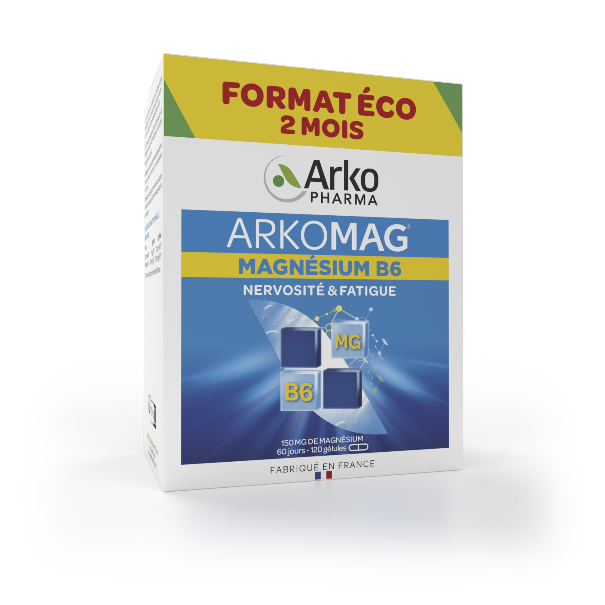 Les laboratoires Arkopharma ont développé ARKOMAG, une formule associant du magnésium d’origine marine et de la vitamine B6. Un manque de magnésium peut être source de fatigue musculaire, d’irritabilité et de nervosité. Notre formule aide à : Maintenir le bon fonctionnement du système nerveux et des fonctions psychologiques normales. Réduire la fatigue et maintenir une bonne fonction musculaire, notamment en période de surmenage.