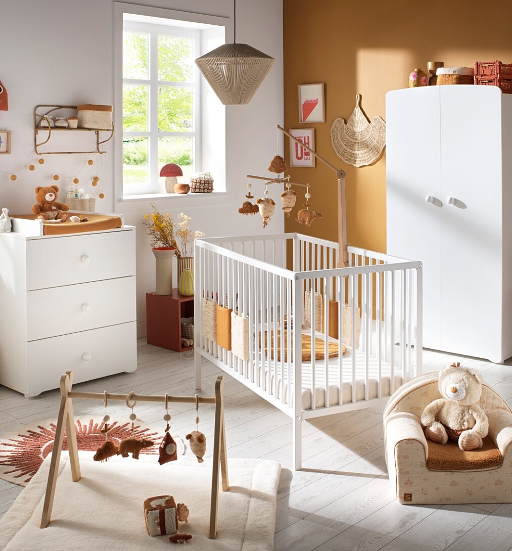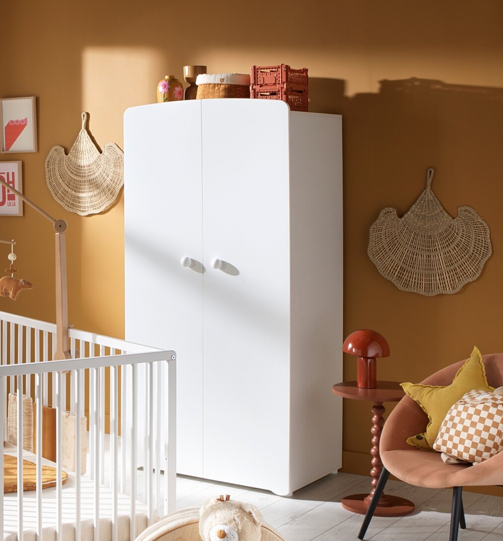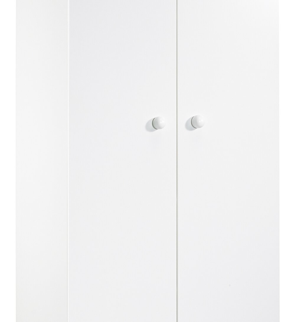 Armoire chambre bébé 2 portes - Boutons boule blanc NEW BASIC Armoire 2 portes boutons "boule" blancs Une collection mixte essentielle pour l'arrivée de bébé, laquée blanc et agrémentée de boutons "boule" blancs. Aménagement intérieur : 3 tablettes mobiles. Penderie. Assortie aux lits 1P032, 1P035 & 1P113 et à la commode 3 tiroirs référence 1P162. Garantie sans solvant. Panneaux garantis avec une teneur en formaldéhydes <=8 mg. Fabrication française. Dimensions: 85 x 175 x 56