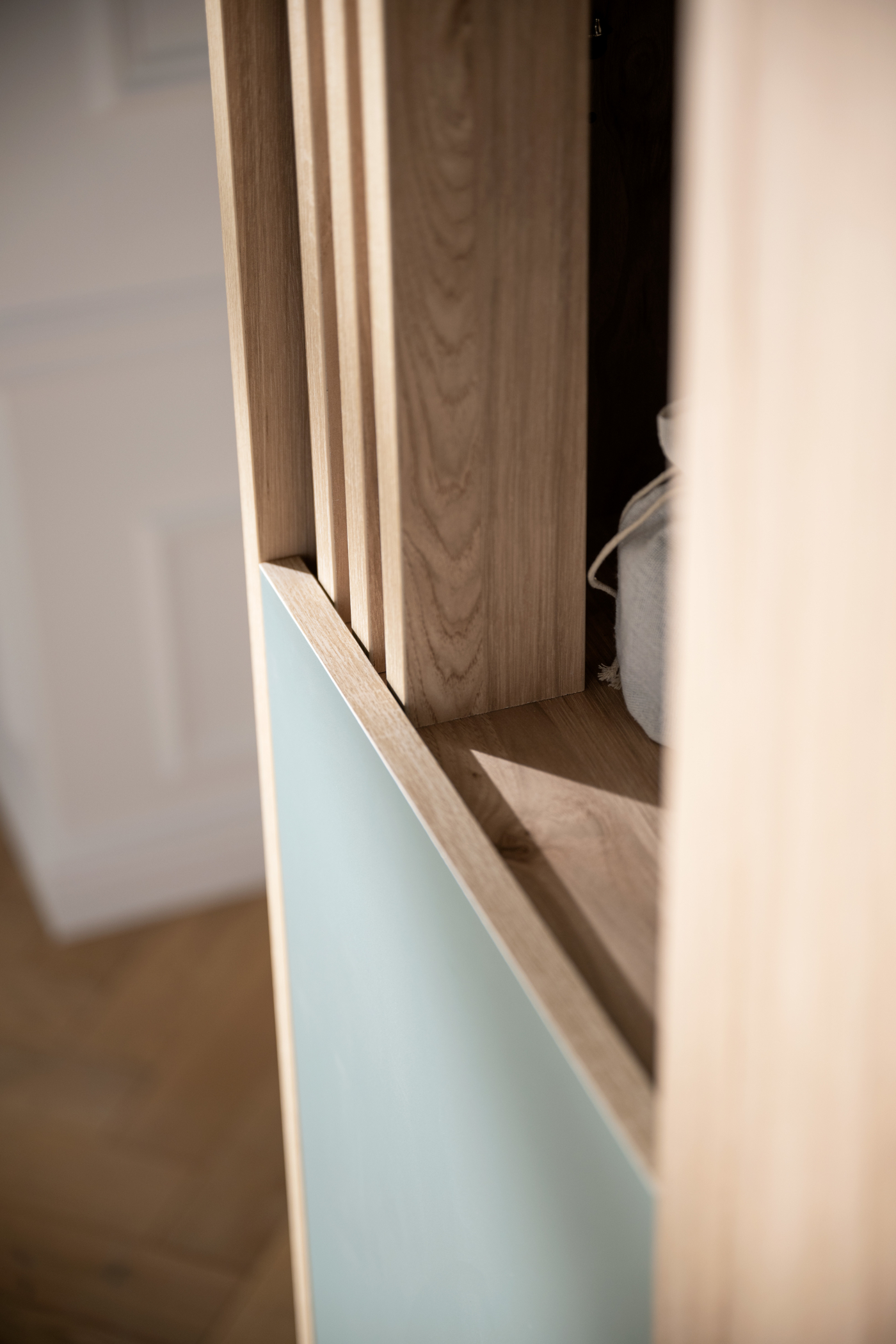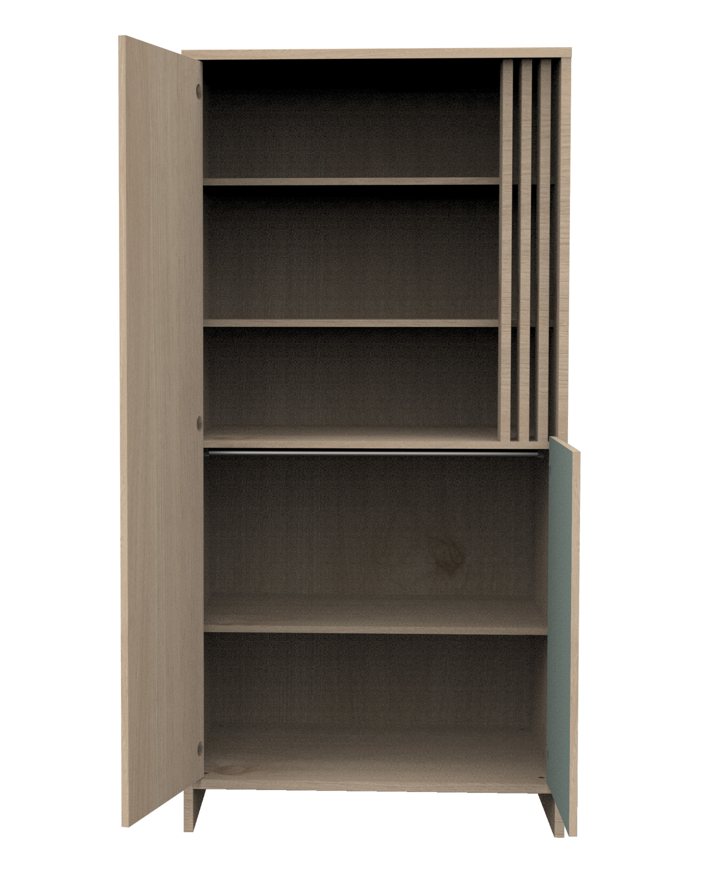 Elle offre un espace de rangement très fonctionnel (grande tringle penderie à positionner au choix et espace fermé en partie basse).